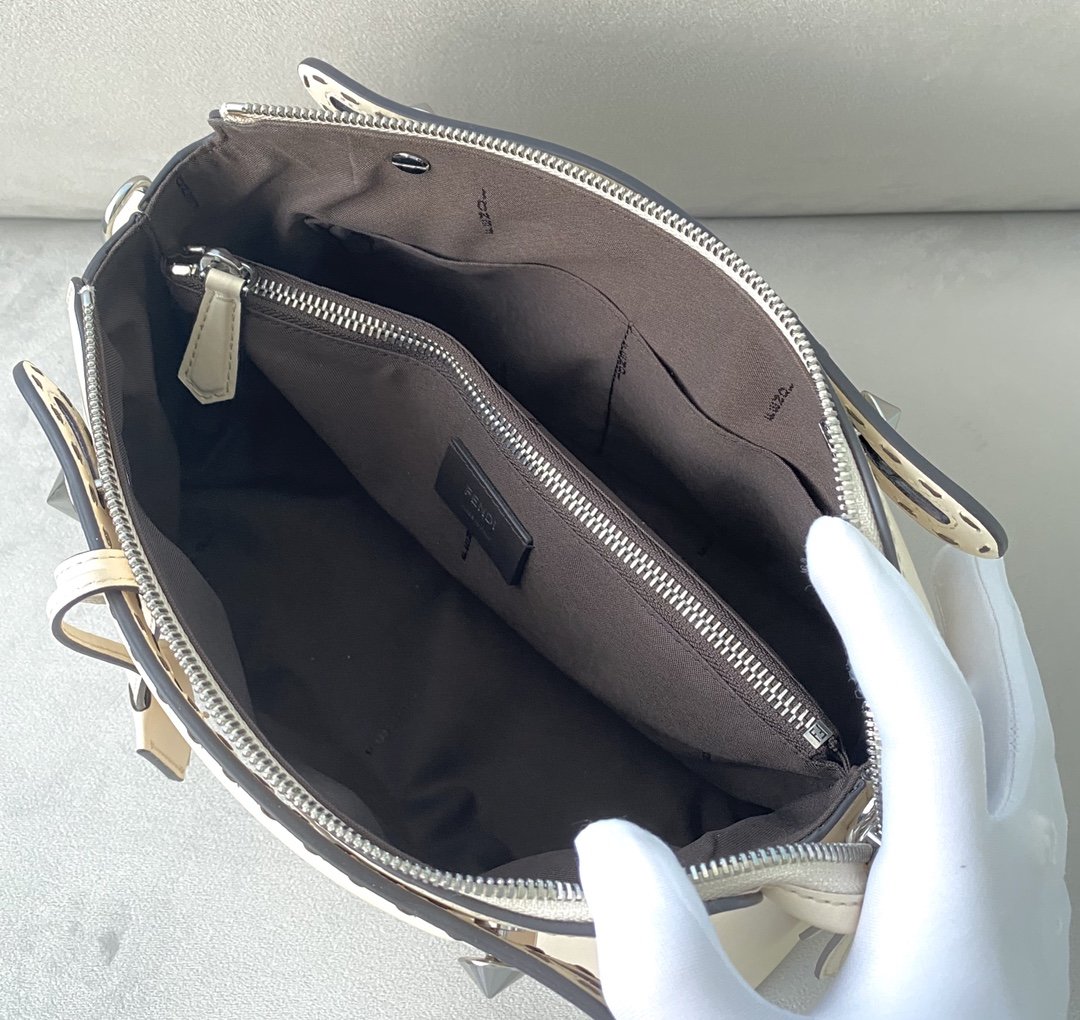 Medium Iconic By The Way Boston bag, made of white with hot-stamped “FI ROMA” and zip fastening. The bag can be carried by hand with the handles, or worn either on the shoulder or cross-body with the adjustable, detachable shoulder strap. Customisable pendant.