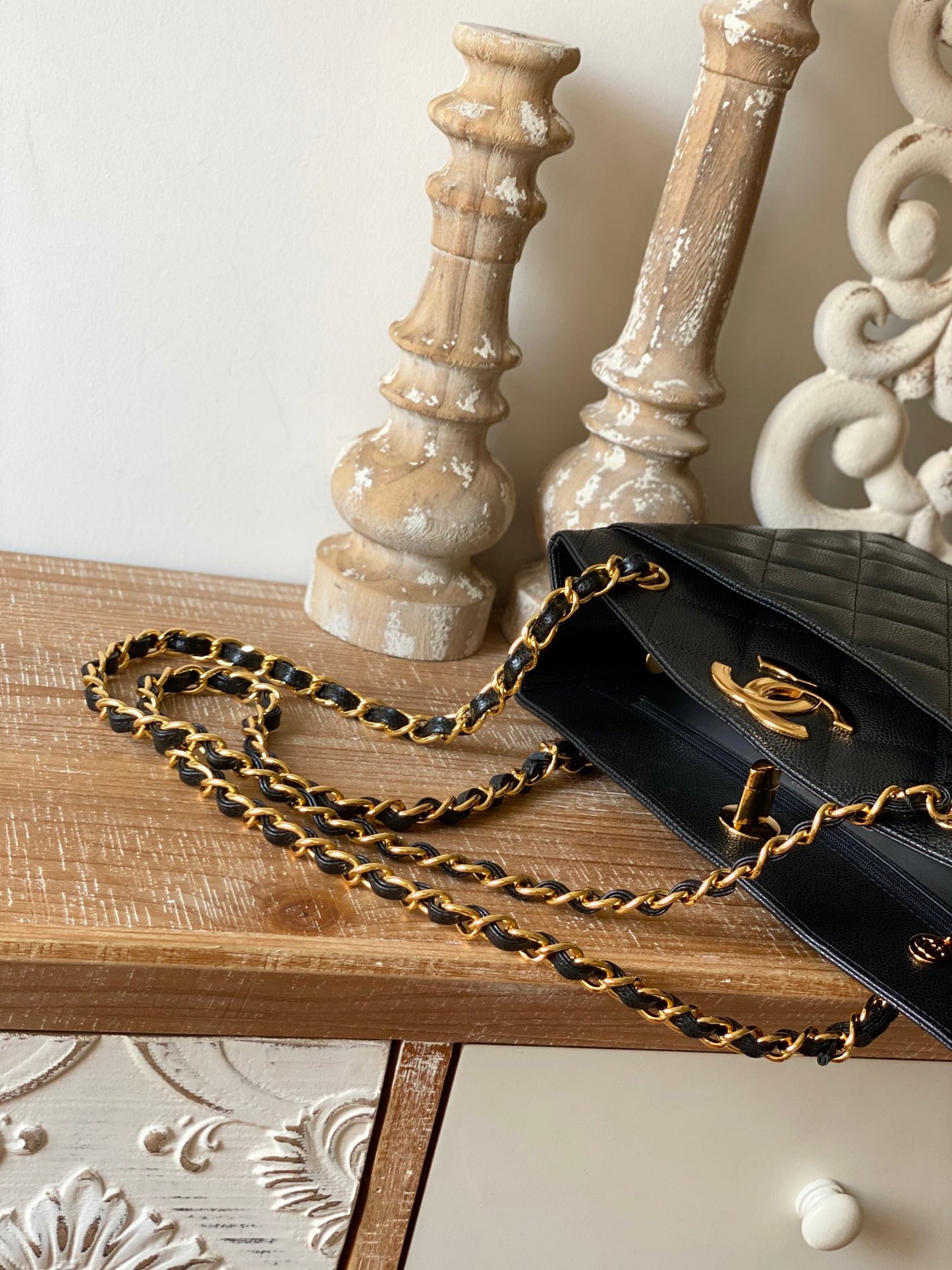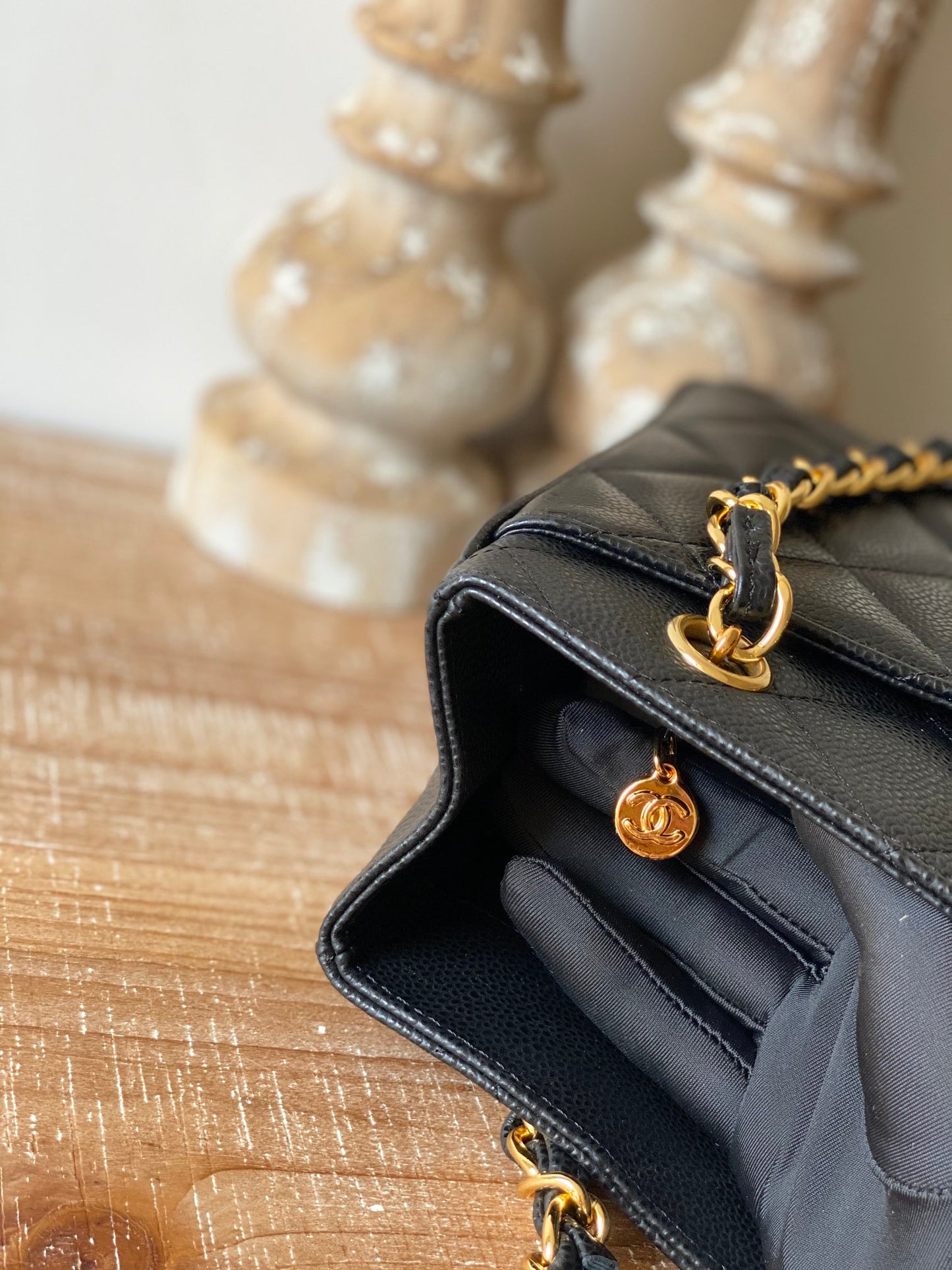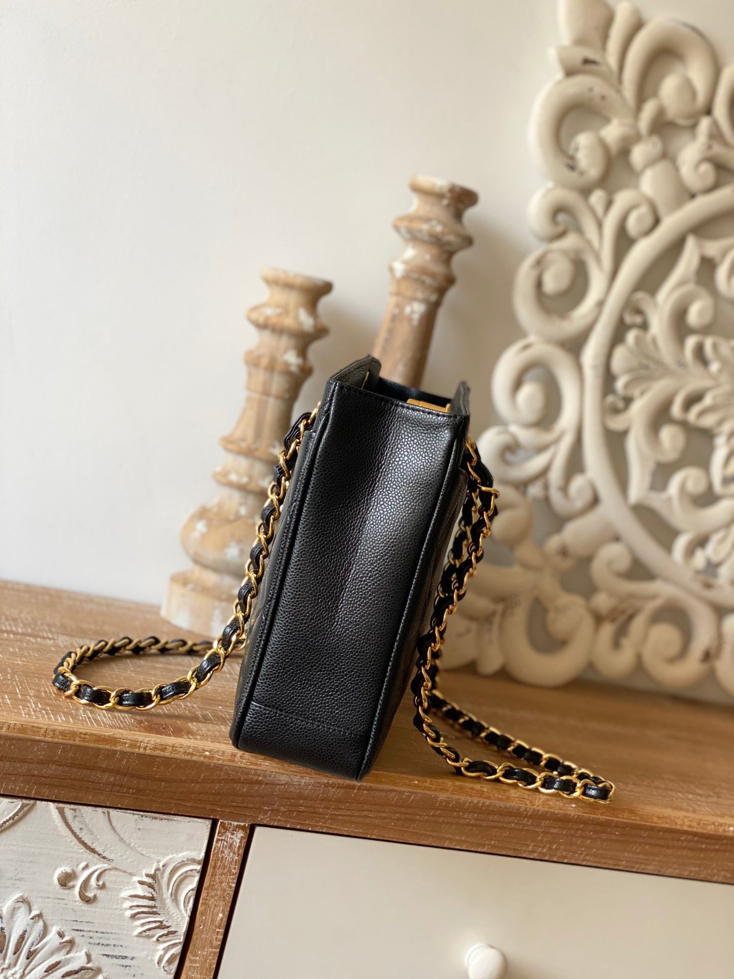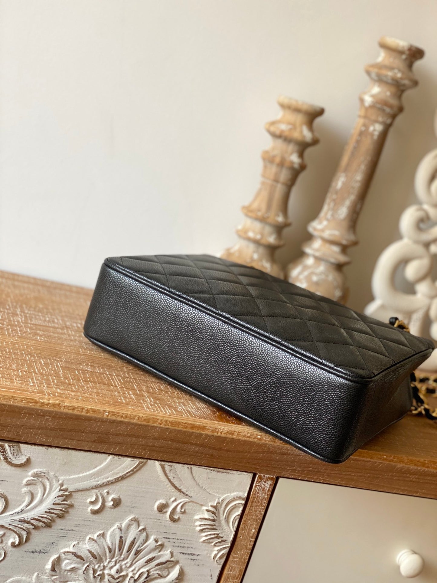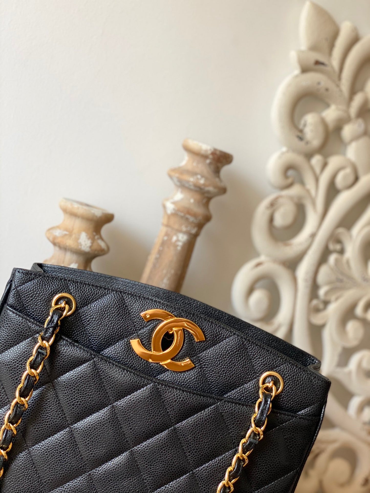 CC Vintage Black Medium Quilted Caviar Tote Bag For Women 28cm/11in