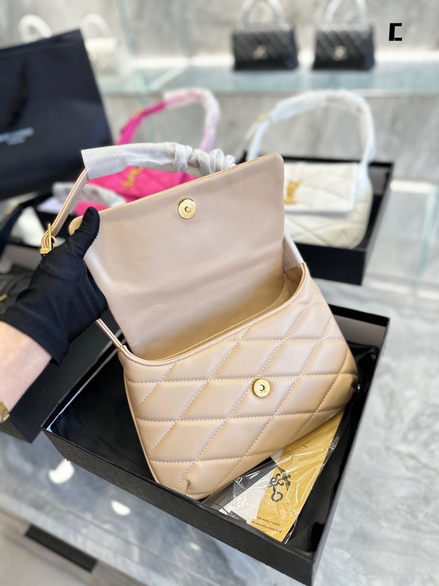 Includes Shipping bags, dustbag sleeper, care manual, booklet, tag.