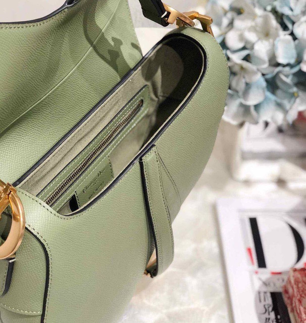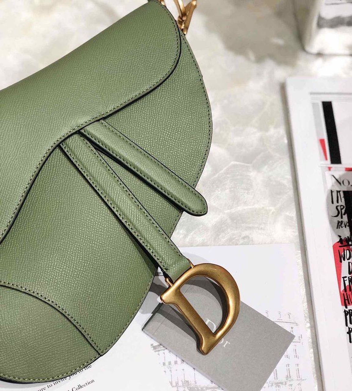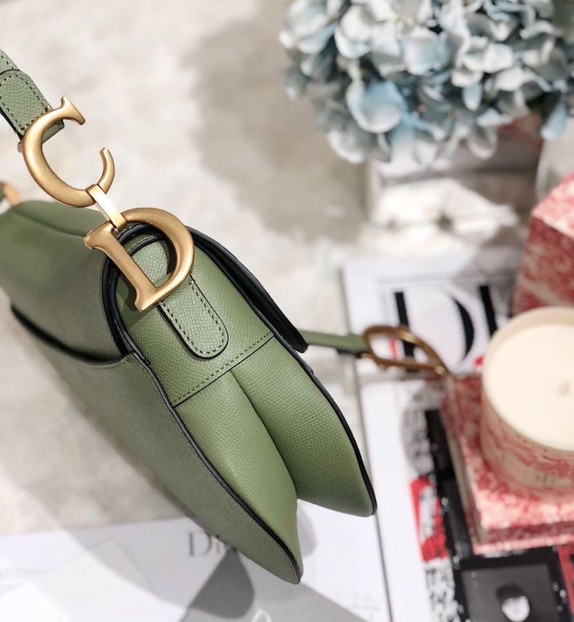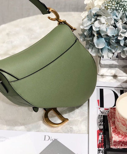 Maria Grazia Chiuri brings a fresh update to the iconic Saddle bag. Featuring a Saddle flap with a magnetic ‘D’ stirrup clasp, the legendary design boasts a ‘CD’ signature on each side of the handle. The cedar green grained style is embellished with antique gold-finish metal hardware and can be carried by hand or worn over the shoulder and can be customized with different shoulder straps