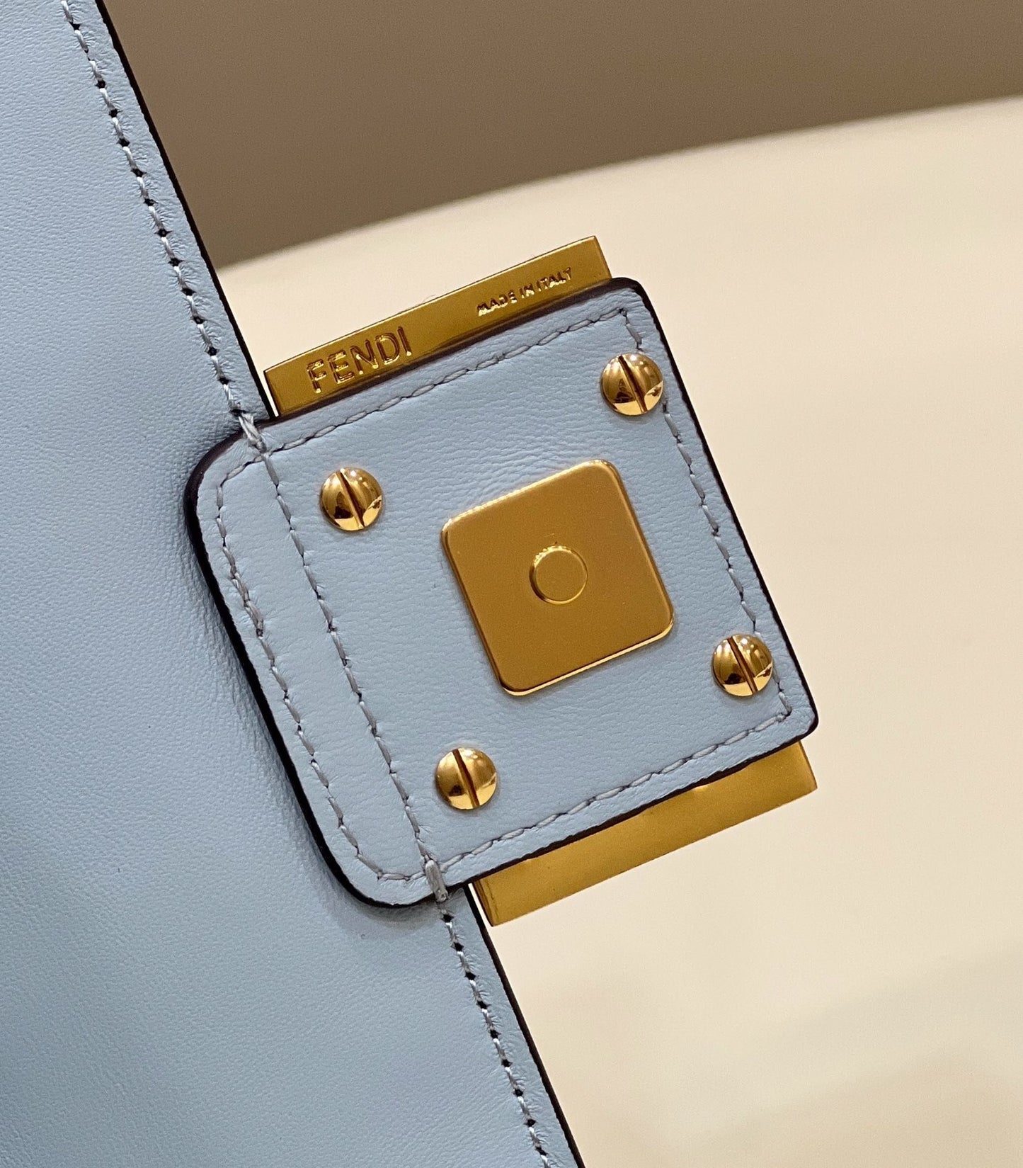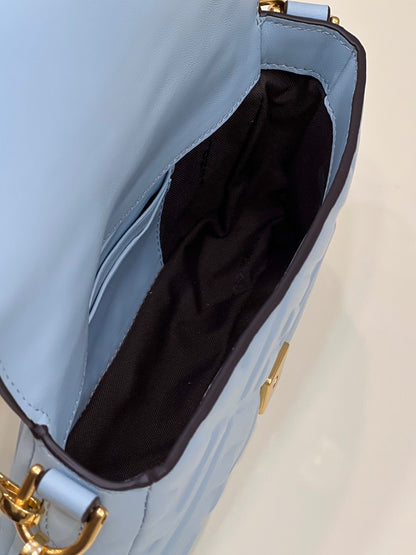 Iconic mini Baguette bag, made of soft blue-coloured nappa with an embossed FF motif and decorated with an FF clasp. The bag can be carried by hand, or worn either on the shoulder or cross-body thanks to the handle and shoulder strap, both detachable.