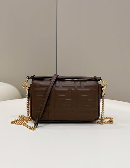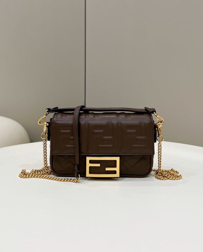 Iconic mini Baguette bag, made of soft brown-coloured nappa with an embossed FF motif and decorated with an FF clasp. The bag can be carried by hand, or worn either on the shoulder or cross-body thanks to the handle and shoulder strap, both detachable.