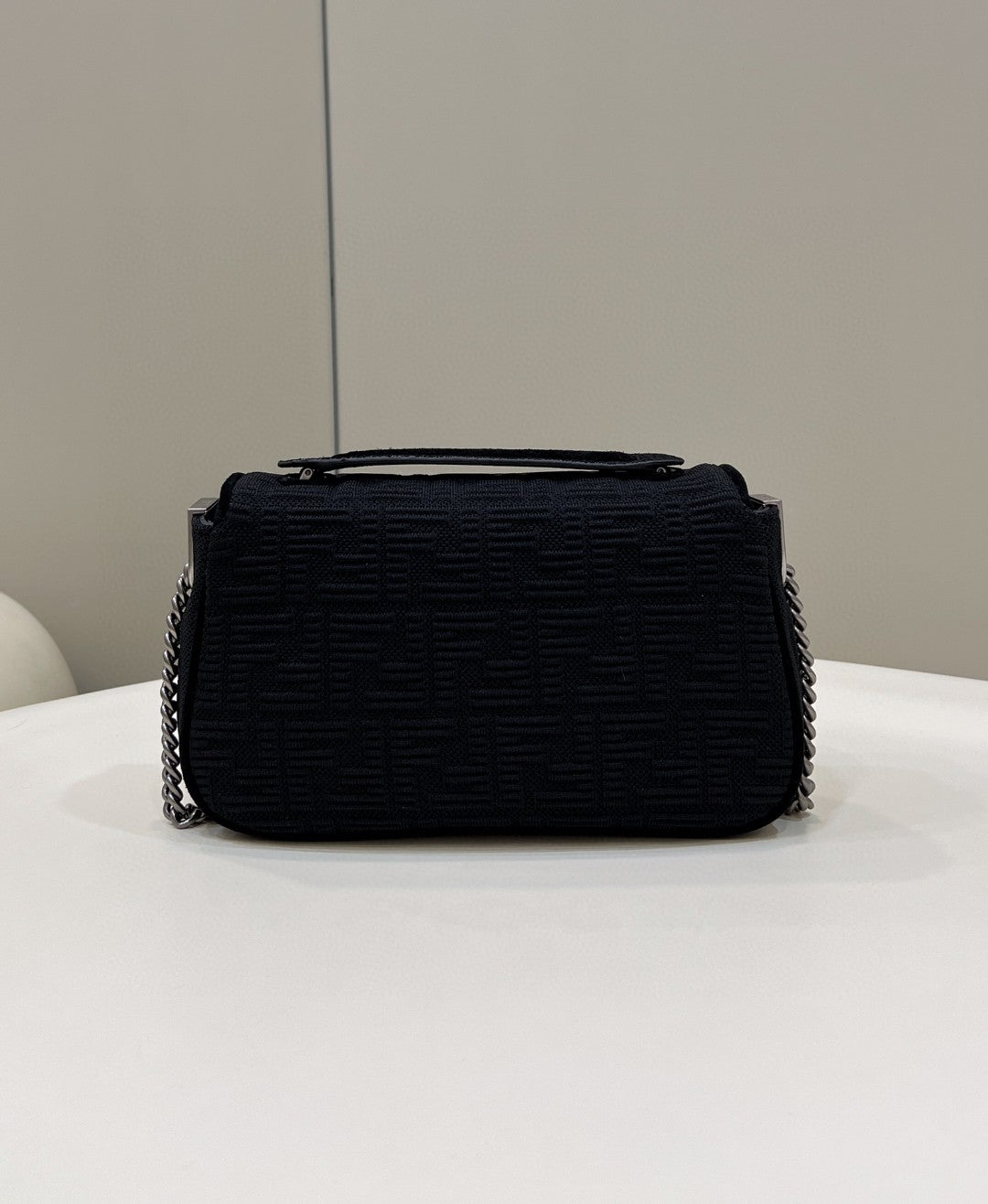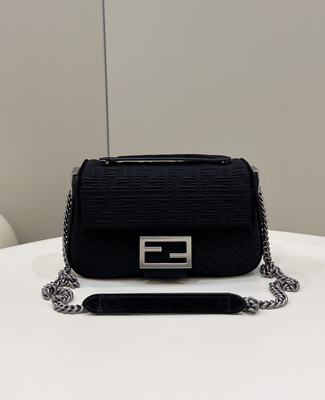 Iconic medium Baguette bag with chain shoulder strap, made of black technical mesh with a 3D texture FF motif. Decorated with an FF clasp.