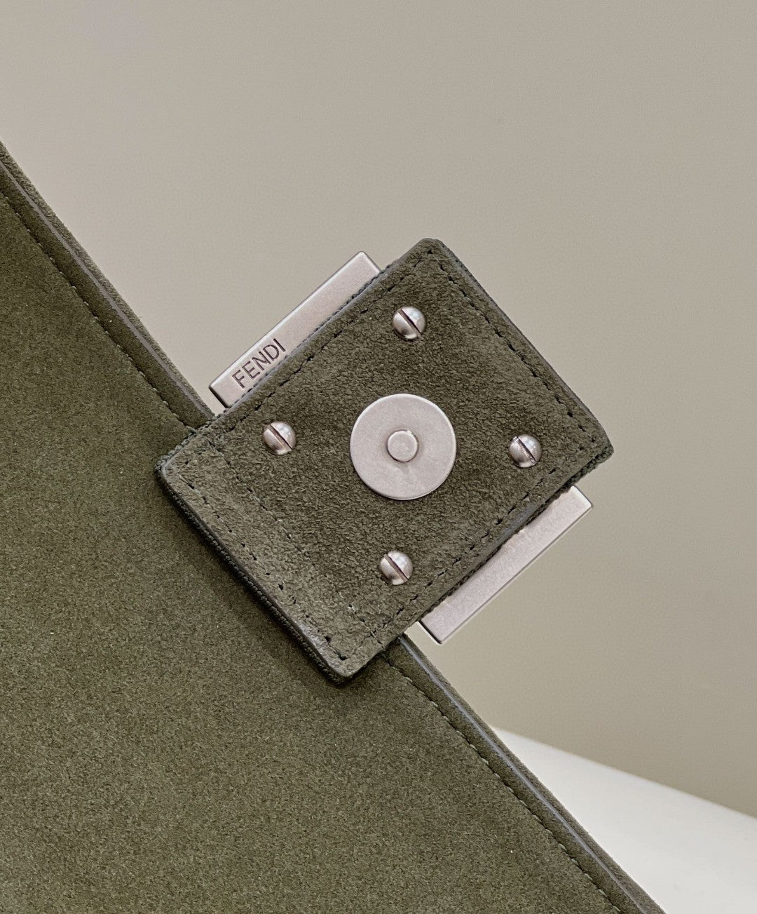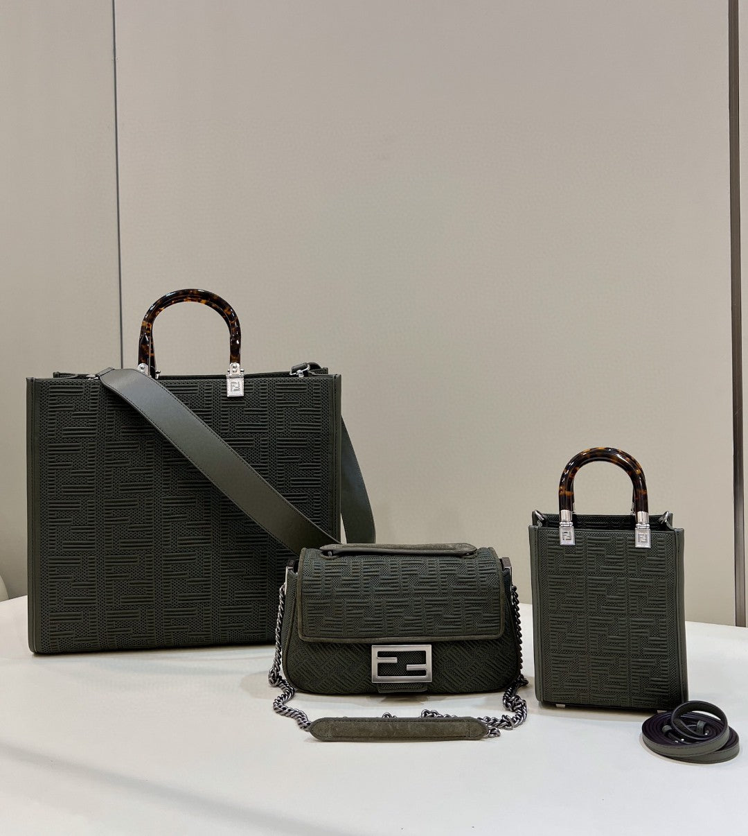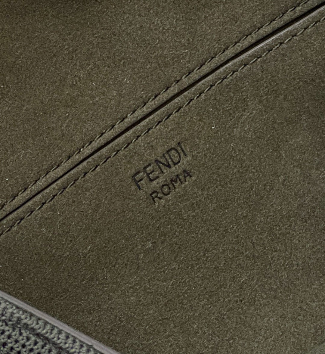 Iconic medium Baguette bag with chain shoulder strap, made of olive green technical mesh with a 3D texture FF motif. Decorated with an FF clasp.