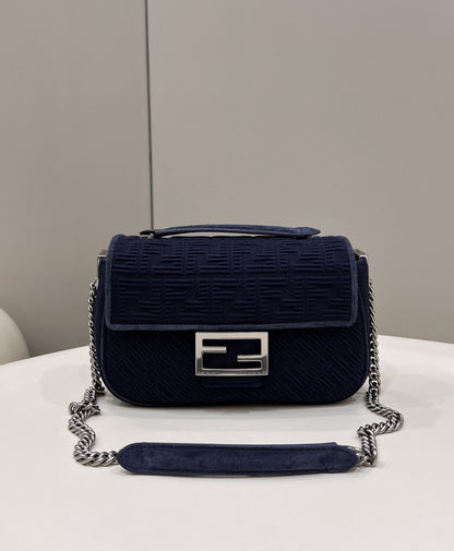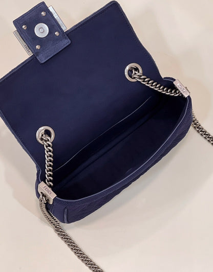 FND Baguette Chain Midi Navy Blue FF Fabric Bag For Woman 14.5cm/6in