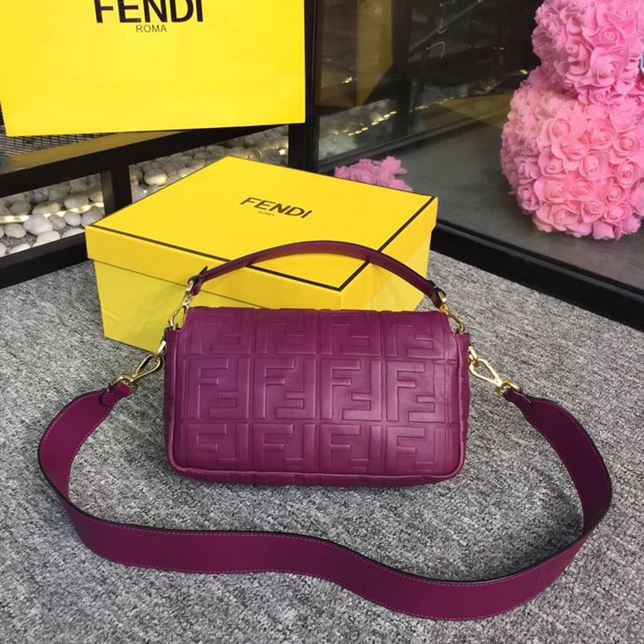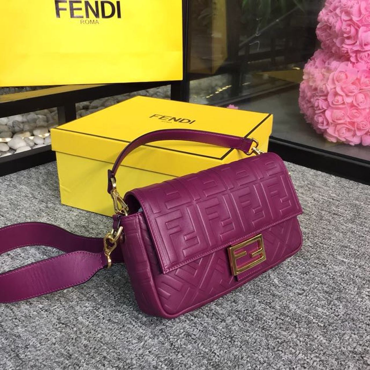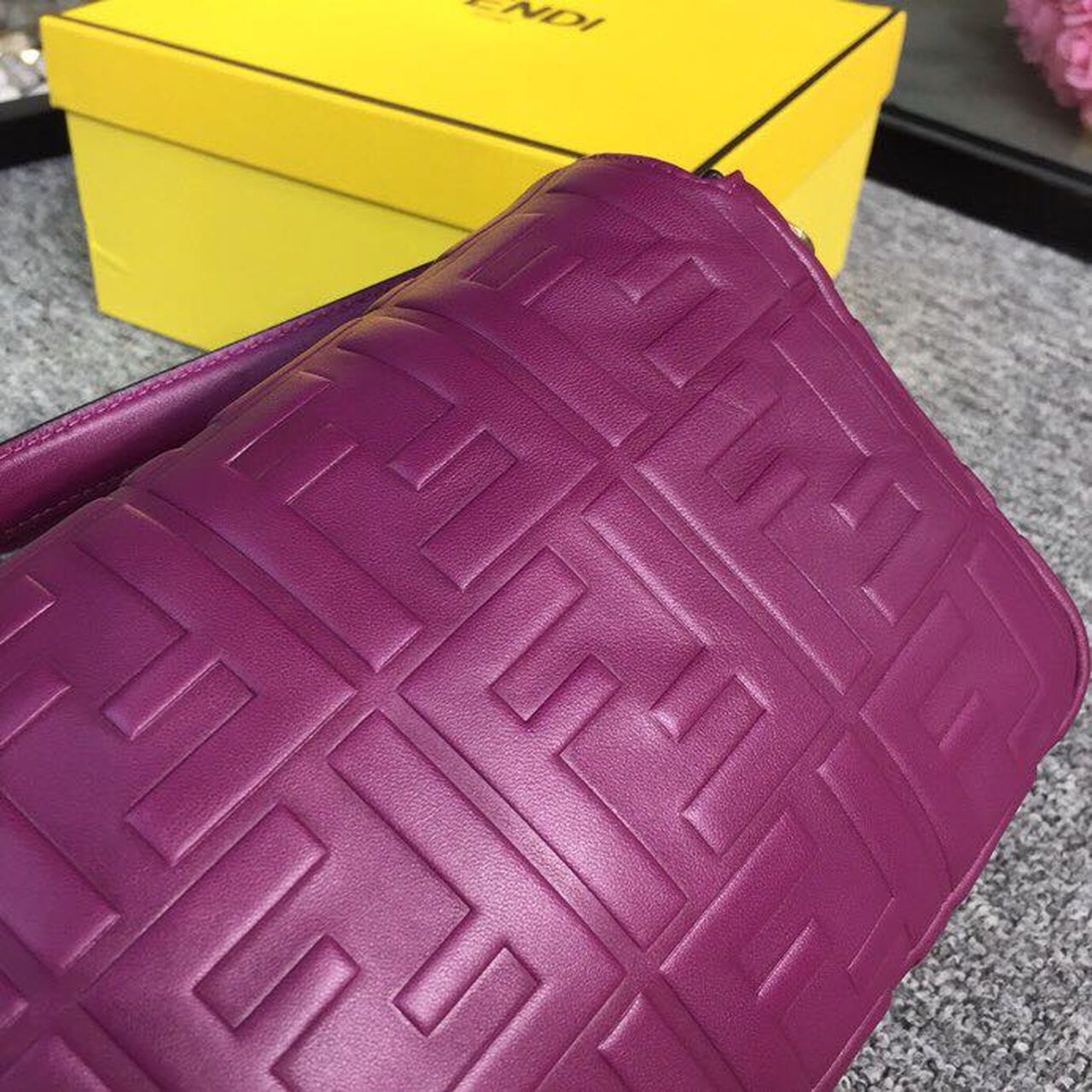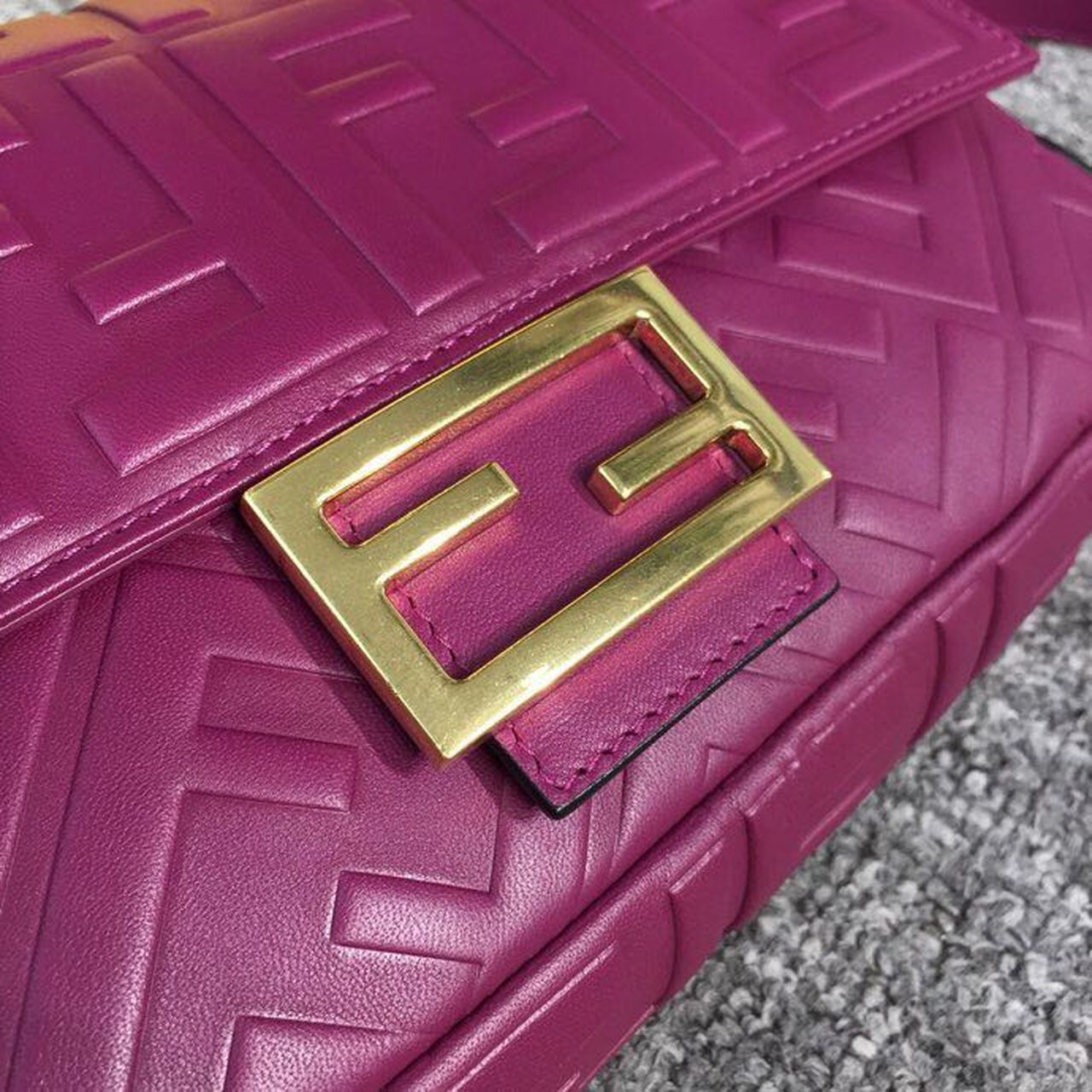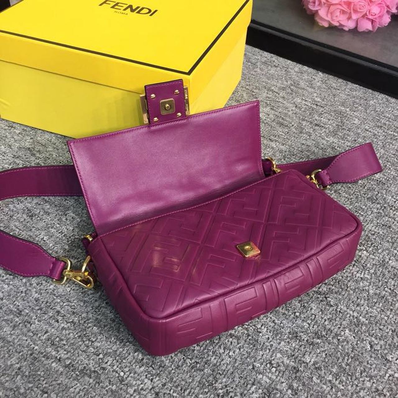 Iconic medium Baguette bag made of purple soft nappa with a three-dimensional texture FF motif. Decorated with an FF clasp. The bag can be carried by hand, or worn either on the shoulder or cross-body thanks to the handle and shoulder strap, both detachable.