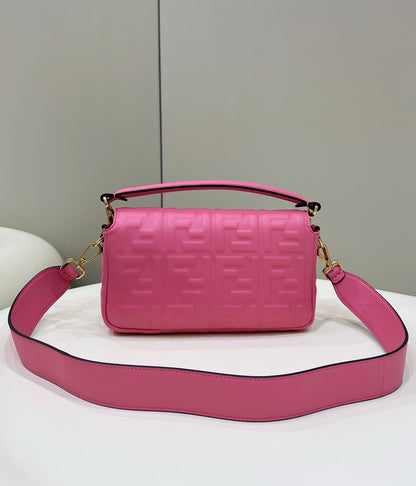 Iconic medium Baguette bag made of pink soft nappa with a three-dimensional texture FF motif. The bag can be carried by hand, or worn either on the shoulder or cross-body thanks to the handle and shoulder strap, both detachable.