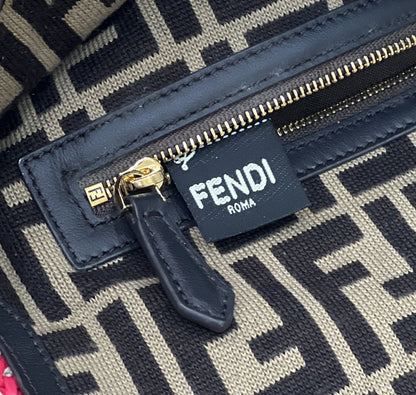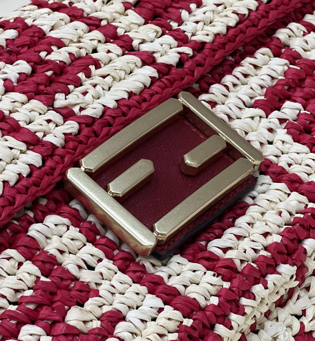 Iconic medium Baguette bag made of crocheted natural-coloured and red hand-woven raffia creating the FF motif. Decorated with an FF clasp.