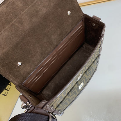 The tech fabric cross-body shoulder strap with FND lettering is adjustable and detachable.