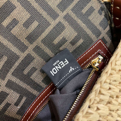 Iconic Baguette bag with flap and FF fastening with magnetic clasp. It can also be worn cross-body thanks to the shoulder strap. Lining with flat pocket. Made of straw woven.