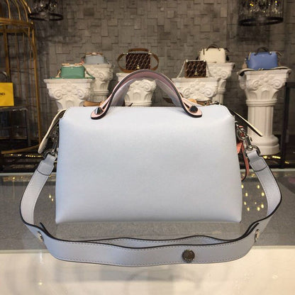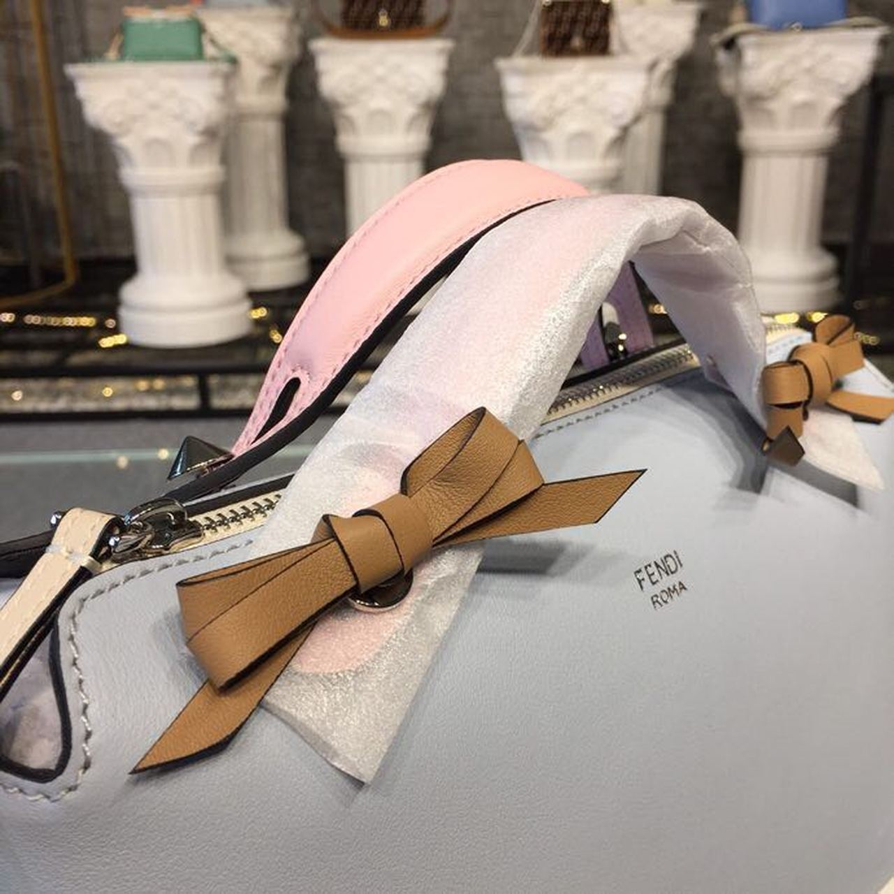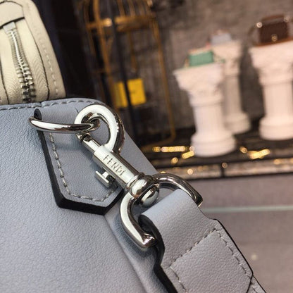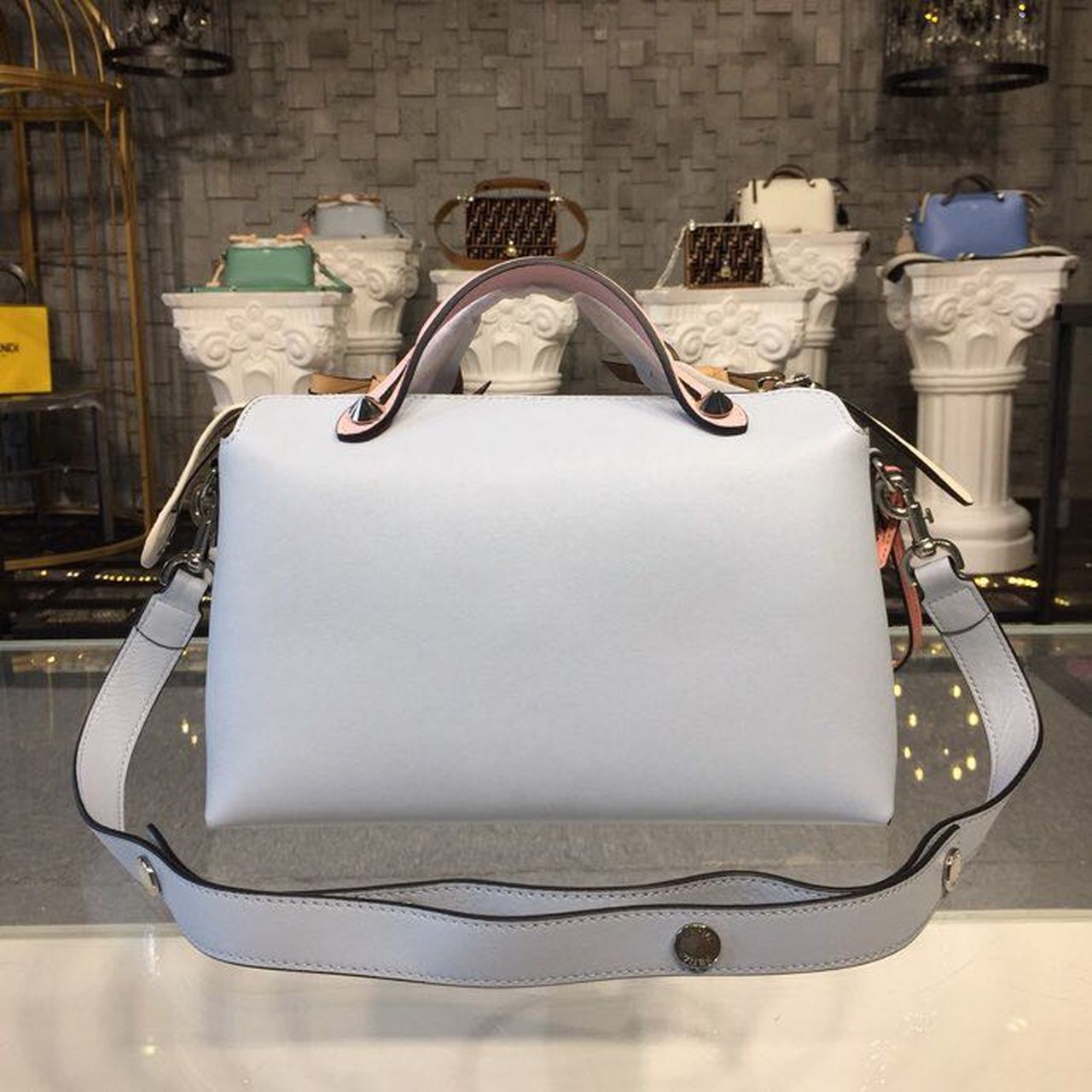 Iconic medium By The Way Boston bag made of light blue, with a zip fastening. The bag can be carried by hand with the handles with an embossed, hand-painted FF motif, or worn either on the shoulder or cross-body with the adjustable, detachable shoulder strap. Customisable pendant with FF motif.