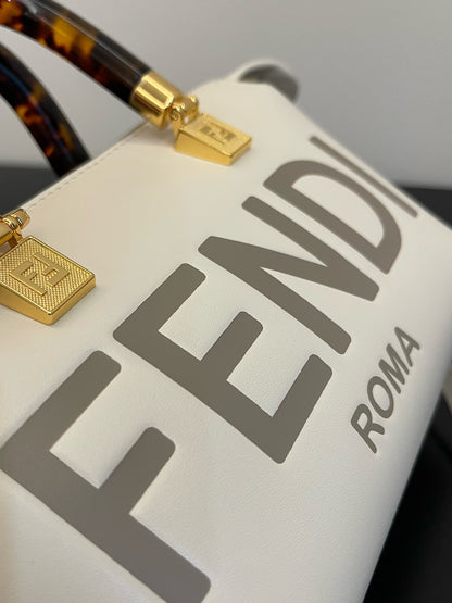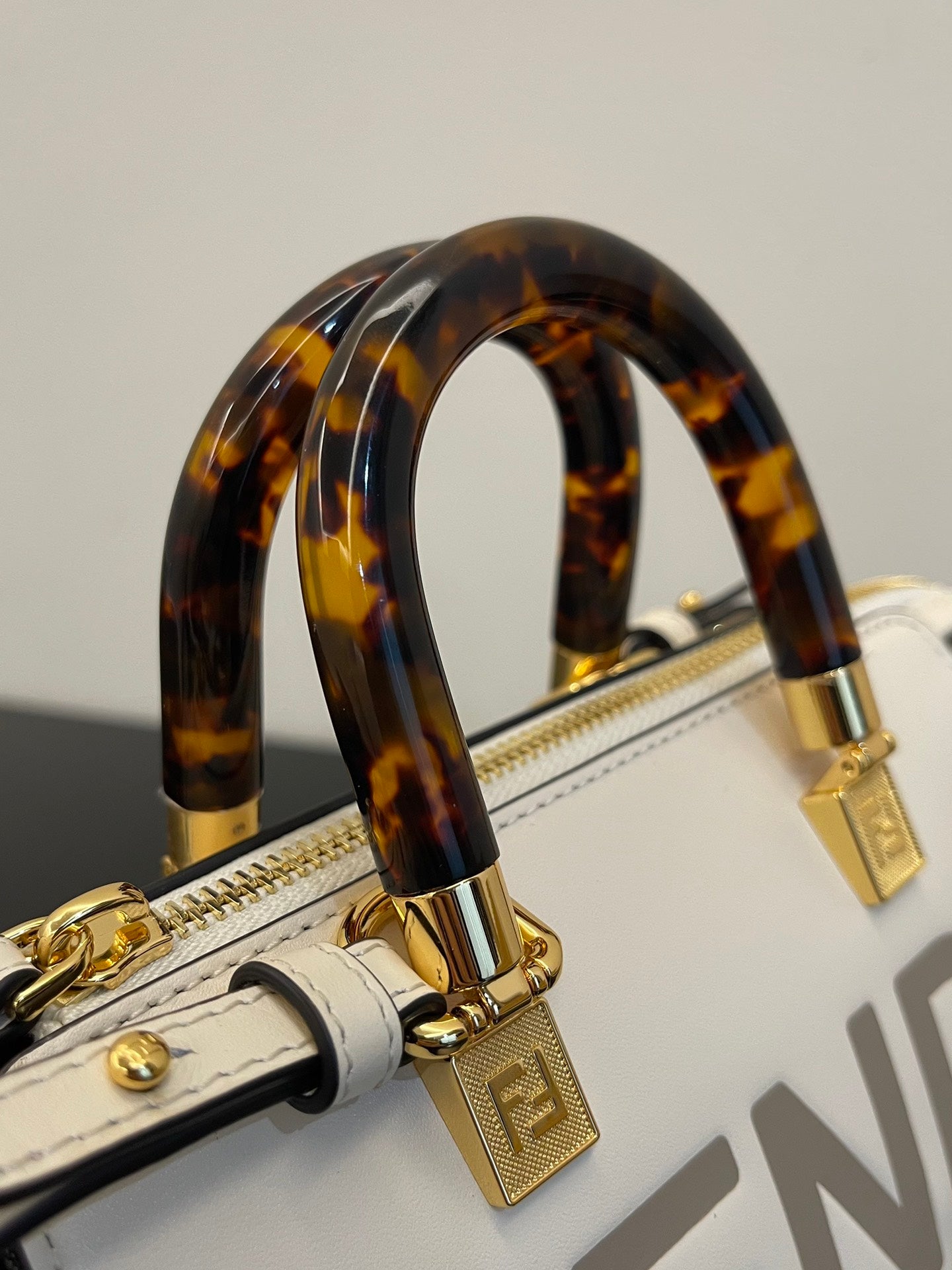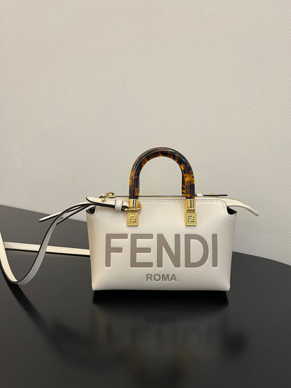 Iconic mini By The Way Boston bag, made of White leather with hot-stamped FND ROMA lettering. Zip fastening.