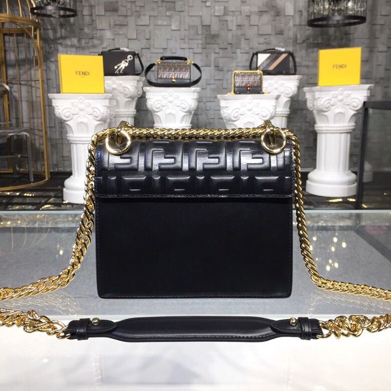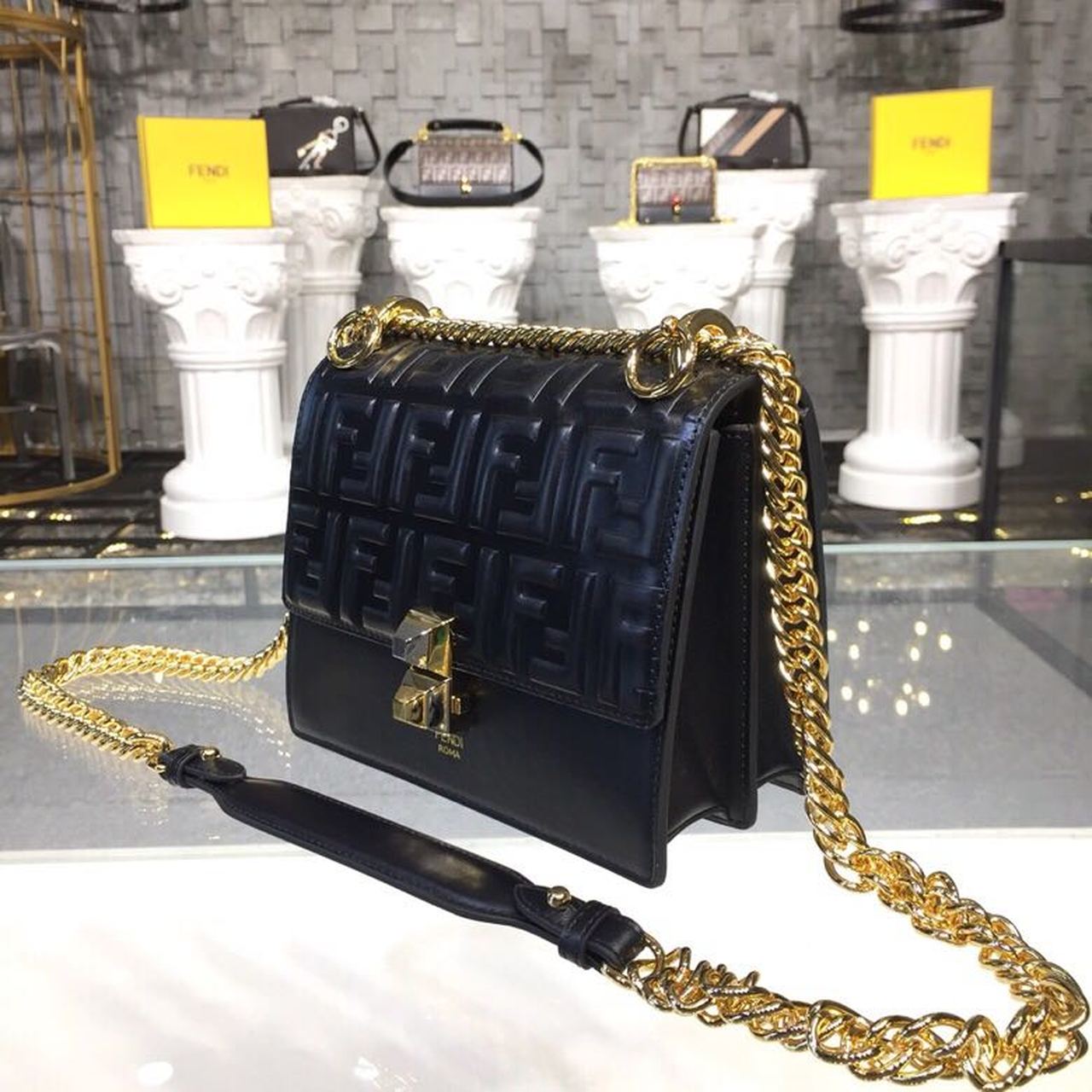FI FF Logo Kan I Bag 9.8in/25cm With Gold Toned Chain Black For Women
