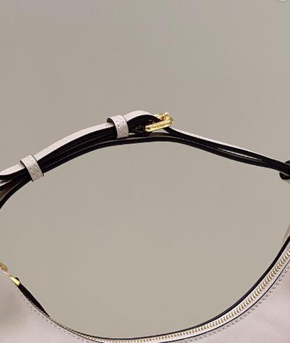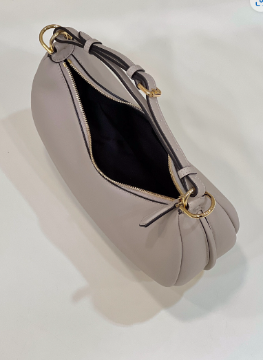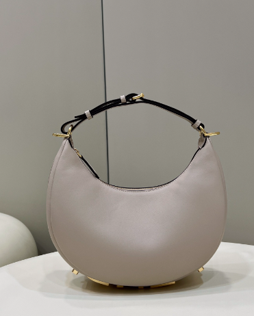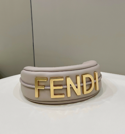 Small hobo bag made of soft beige leather, decorated with vintage gold metal FND lettering visible when wearing the bag under the arm.