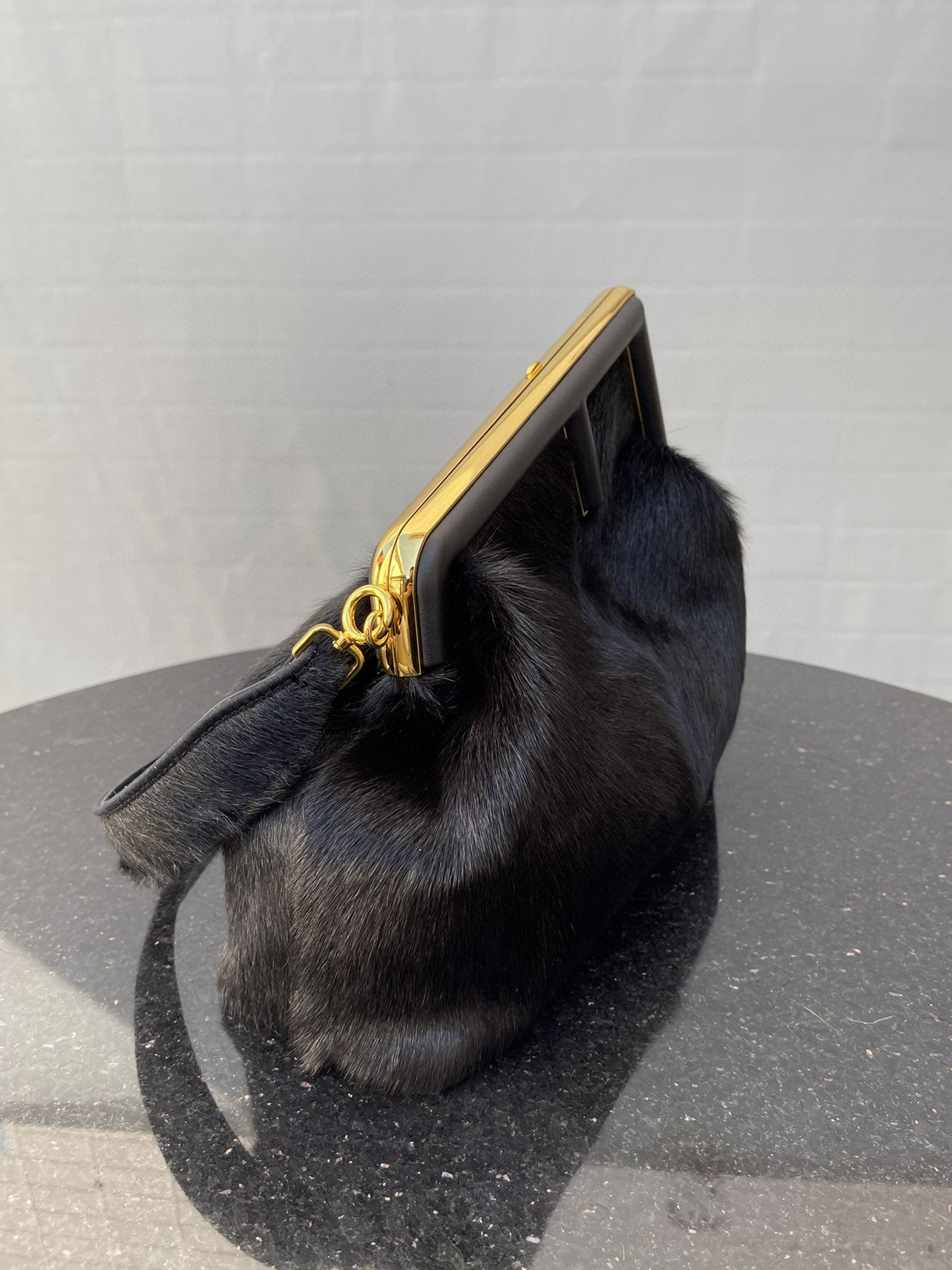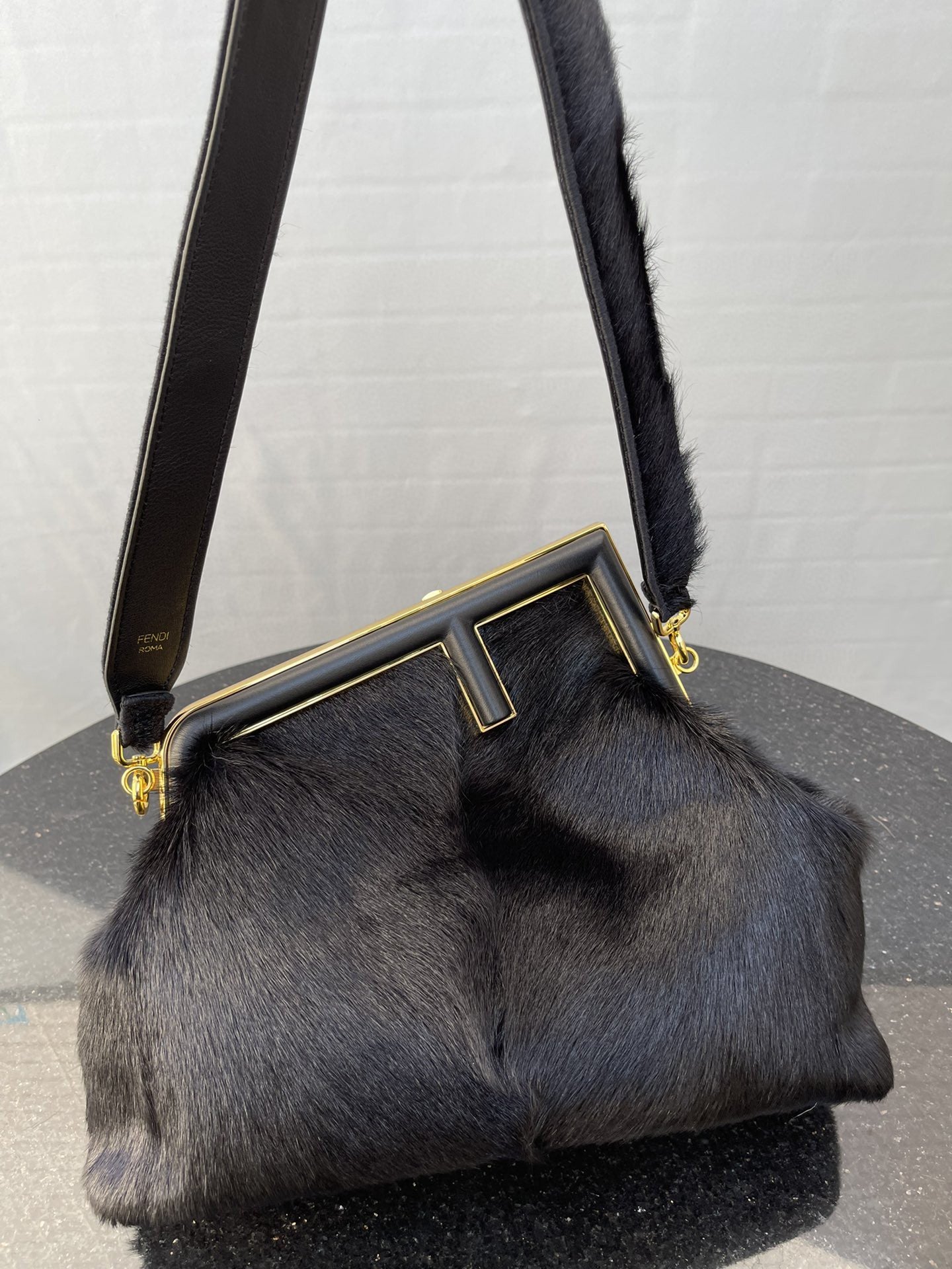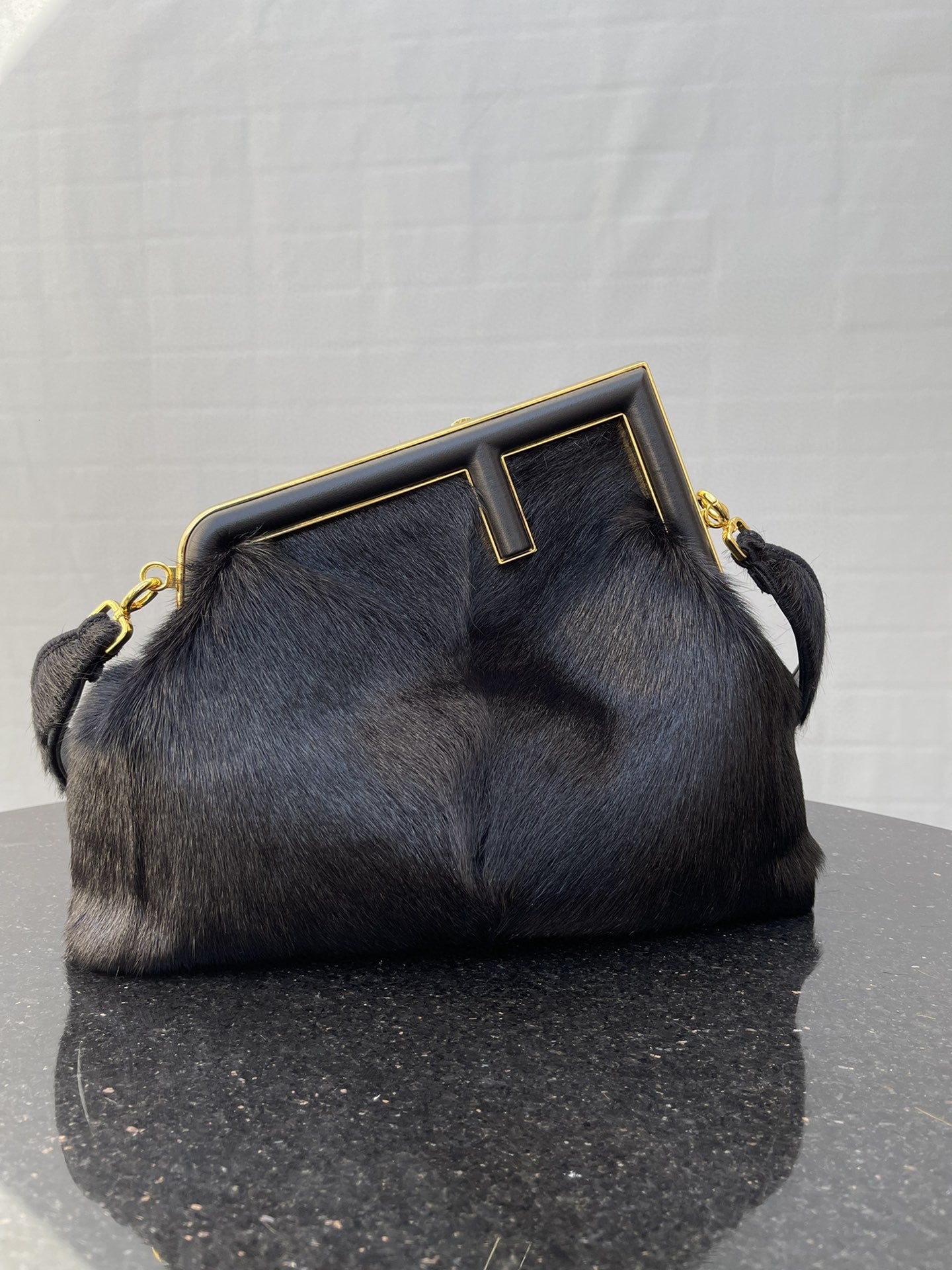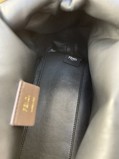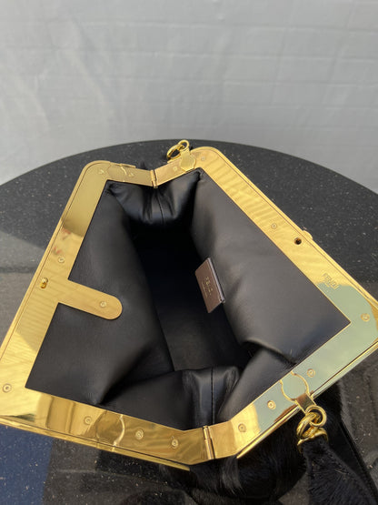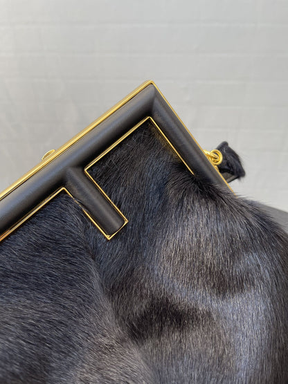 Medium FND First bag made of black recycled fox fur patches. Oversized metal F clasp bound in tone on tone nappa leather.