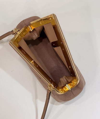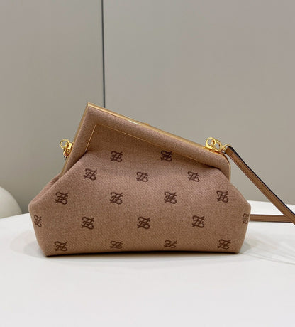 Small FND First bag made of soft, caramel coloured nappa leather, with metal macro F fastening bound in tone on tone nappa leather.