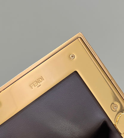Small FND First bag made of soft, brown canvas with oversized metal F clasp wrapped in tone on tone nappa. Can be carried by hand as a clutch or worn on the shoulder thanks to the detachable shoulder strap.