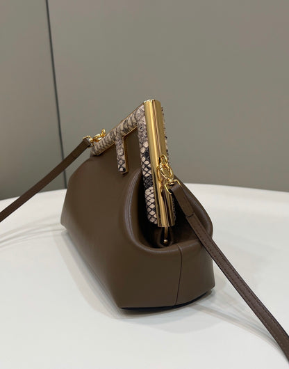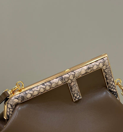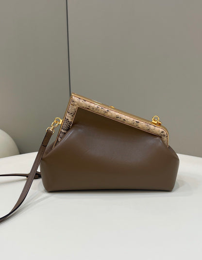 Small FND First bag made of soft, dark brown nappa with oversized metal F clasp wrapped in tone on tone python. Can be carried by hand as a clutch or worn on the shoulder thanks to the detachable shoulder strap.