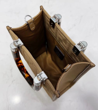 Mini Sunshine Shopper bag made of beige technical mesh with 3D texture FF motif and stiff tortoiseshell plexiglass effect handles. Can be carried by hand or worn on the shoulder thanks to the two handles and detachable shoulder strap.