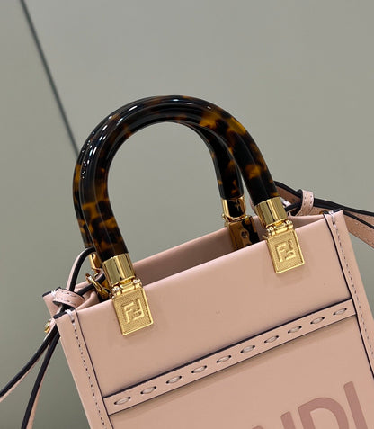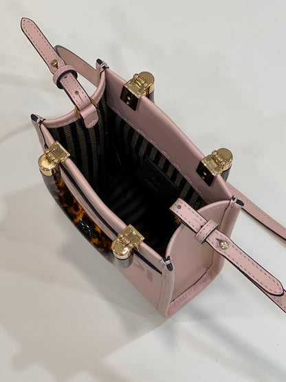 Mini Sunshine Shopper bag in pale pink with hot-stamped FND ROMA print and tortoiseshell-effect plexiglass rigid handles. With an interior lined compartment, tone on tone leather trim, gold-finish metalware. Can be carried by hand or worn on the shoulder thanks to the two handles and thin adjustable and detachable shoulder strap.