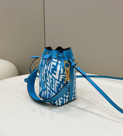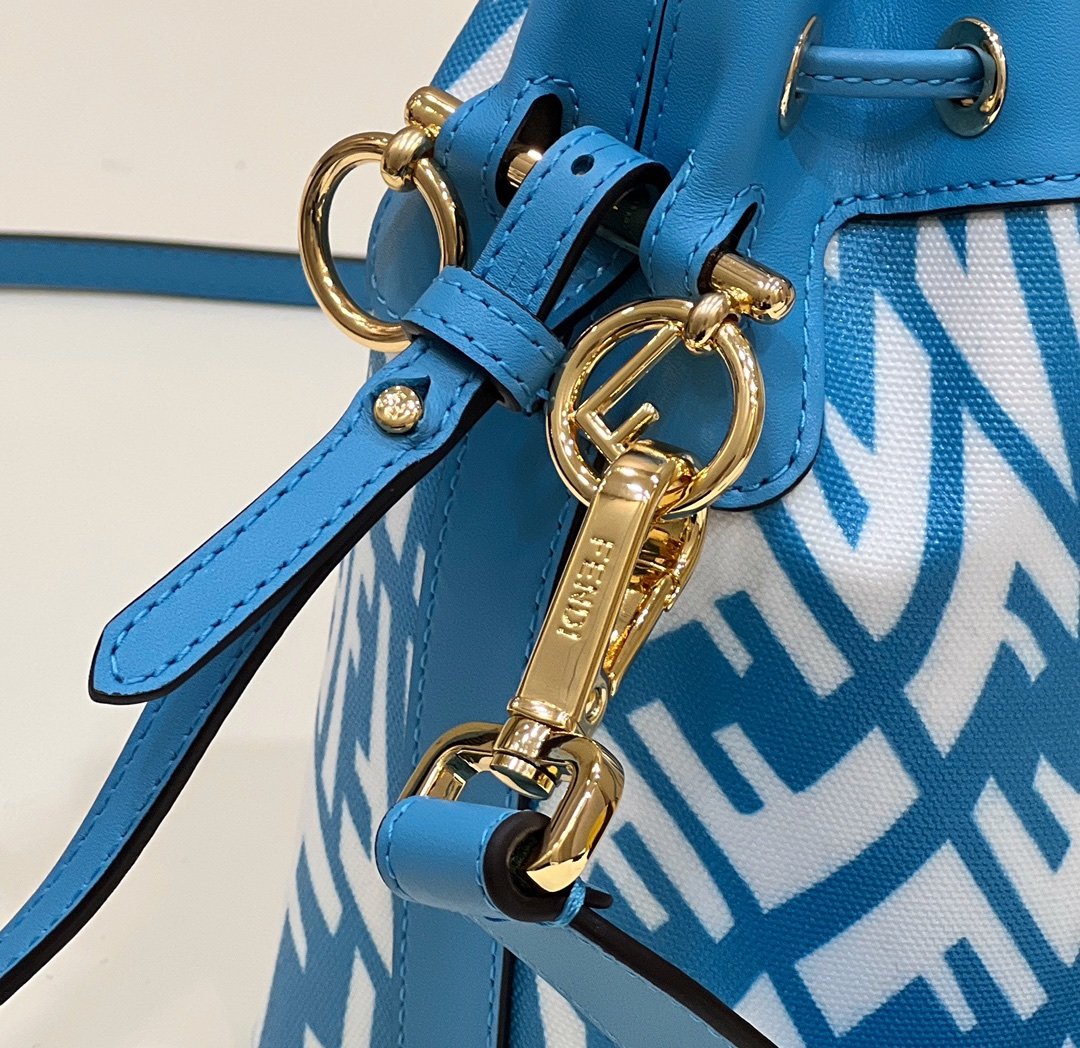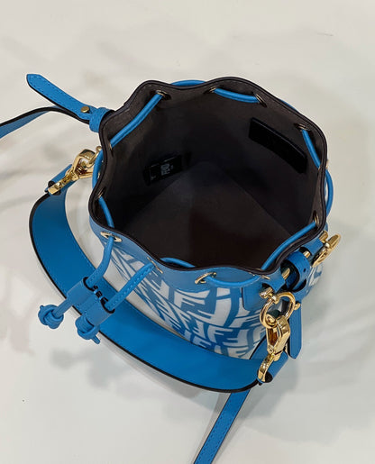 Small Mon Tresor bucket bag made of blue canvas with a white raised FF motif and trimmed in tone on tone. Metal accessories in a vintage-gold finish. Featuring two detachable shoulder straps, one long and one short, to wear the bag over the shoulder or cross-body.