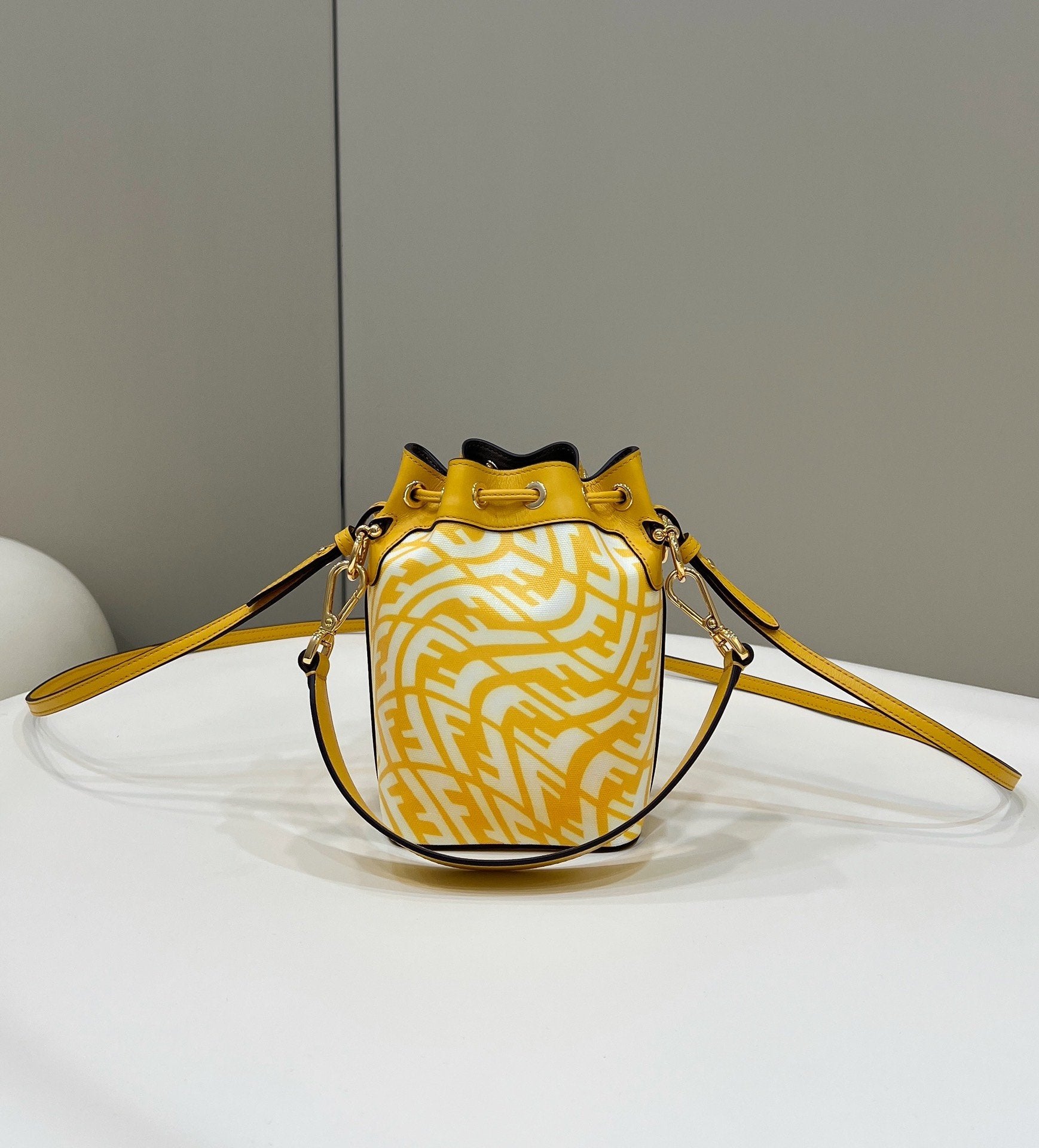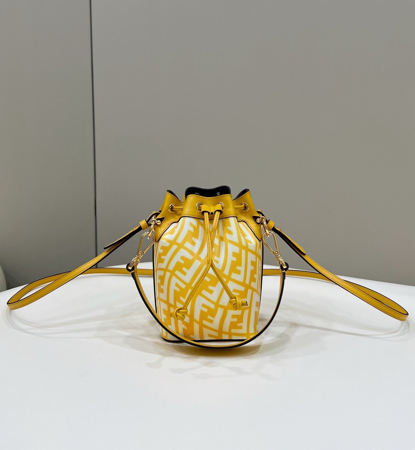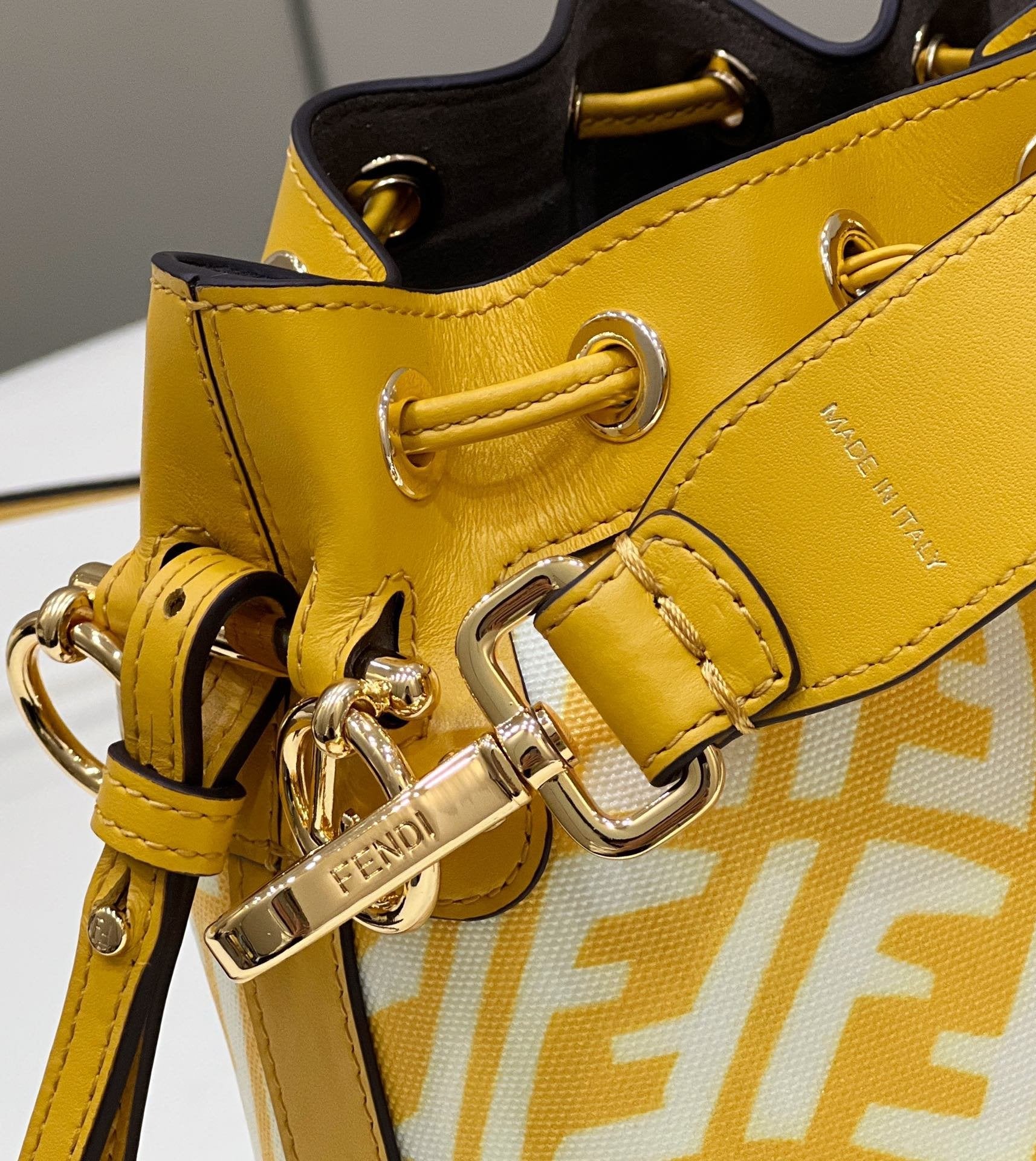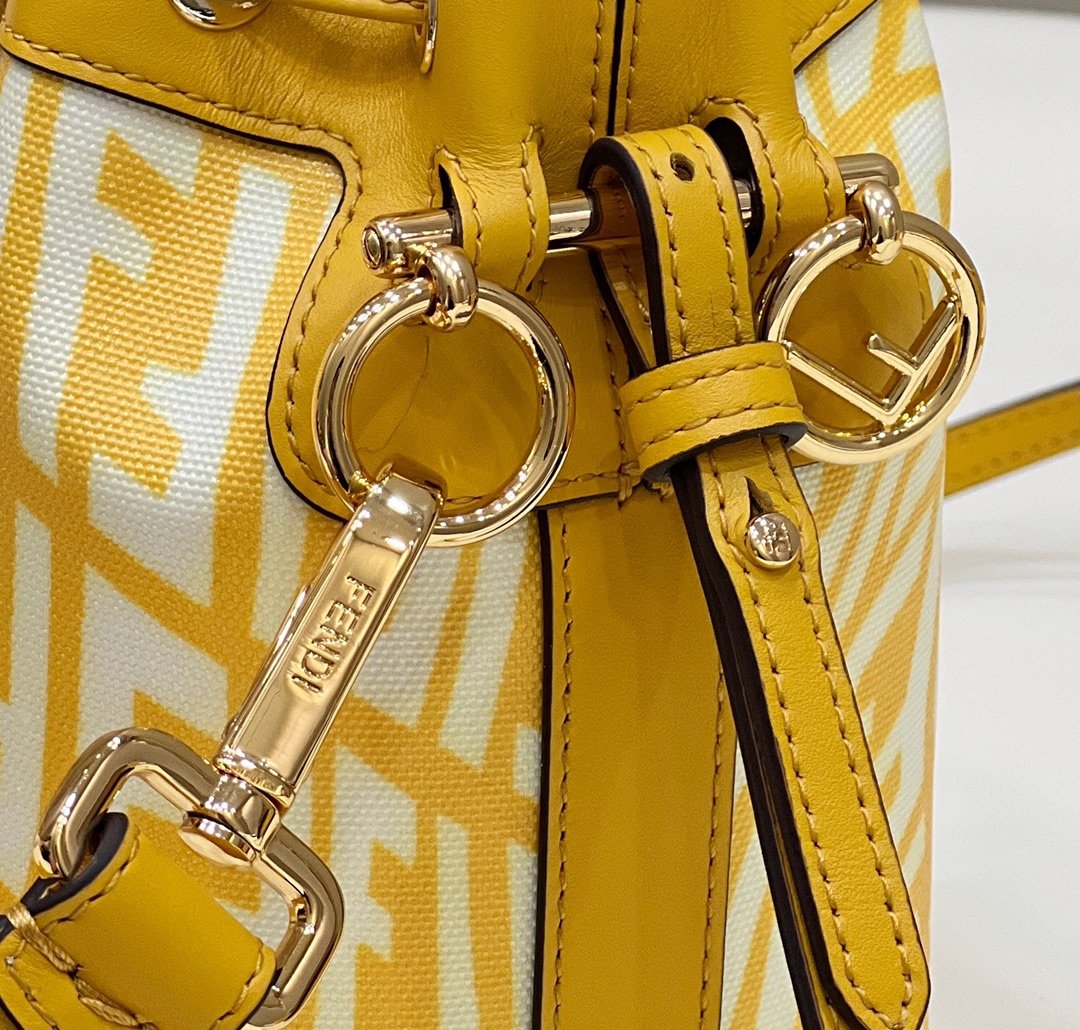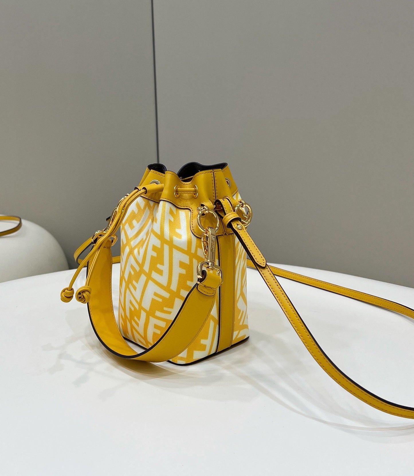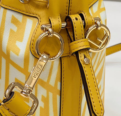 Small Mon Tresor bucket bag made of yellow canvas with a white raised FF motif and trimmed in tone on tone. Metal accessories in a vintage-gold finish. Featuring two detachable shoulder straps, one long and one short, to wear the bag over the shoulder or cross-body.