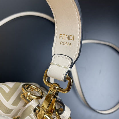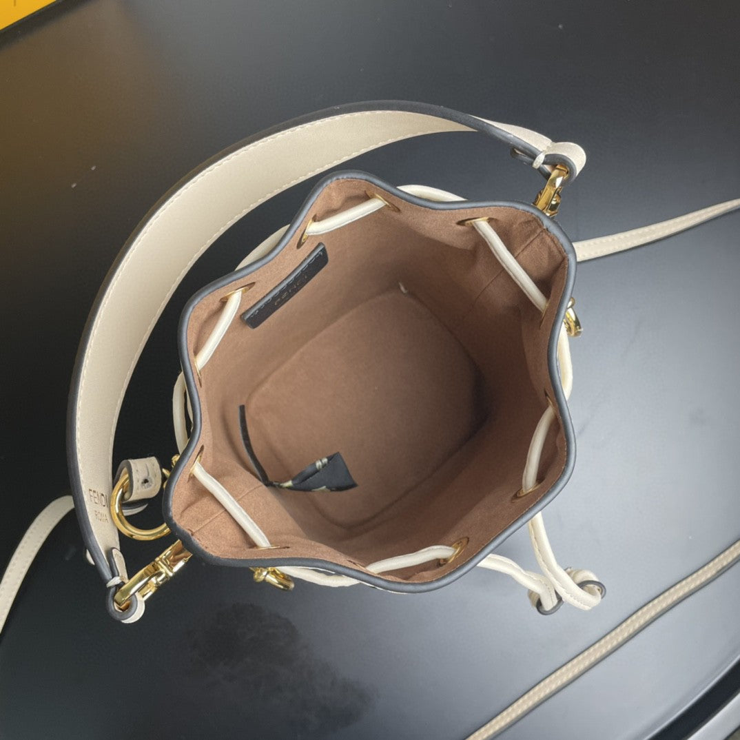 Mini Mon Tresor bucket bag with drawstring fastening and metal decorations in the FND logo shape. Two detachable shoulder straps, one long and one short, to wear the bag over the shoulder or cross-body. Made of beige leather. Finished with embossed FF motif print and hand painted in pink. Gold-finish metalware.