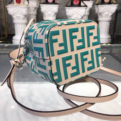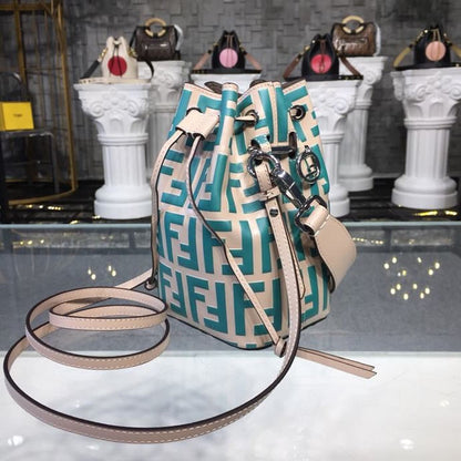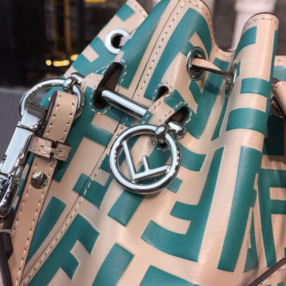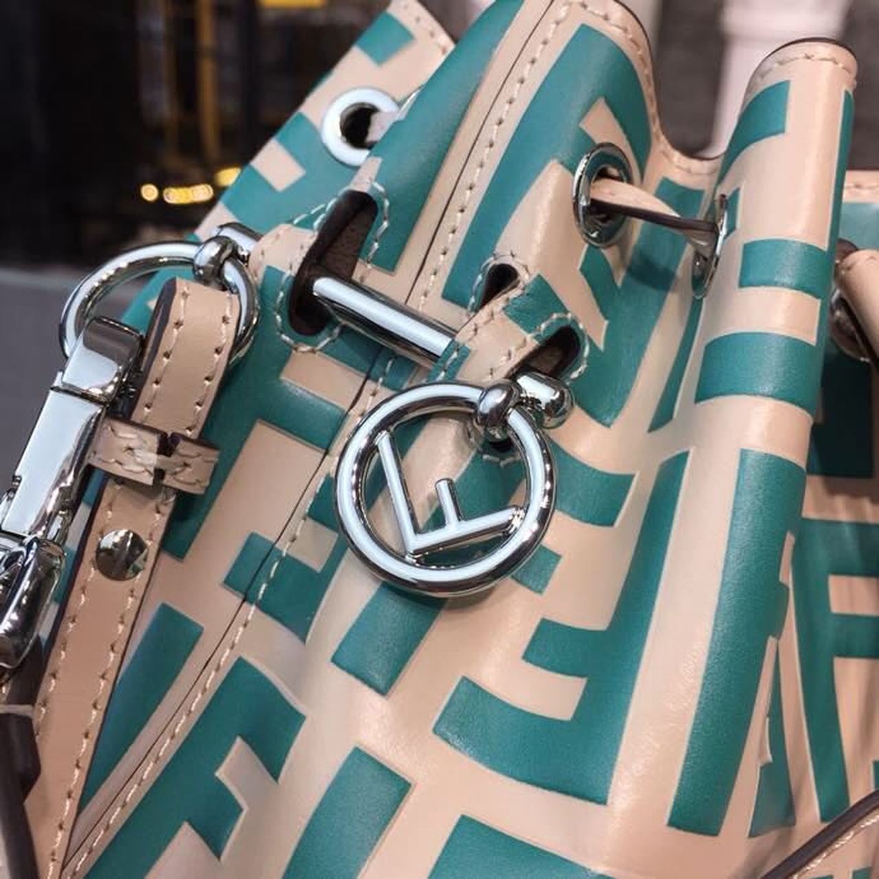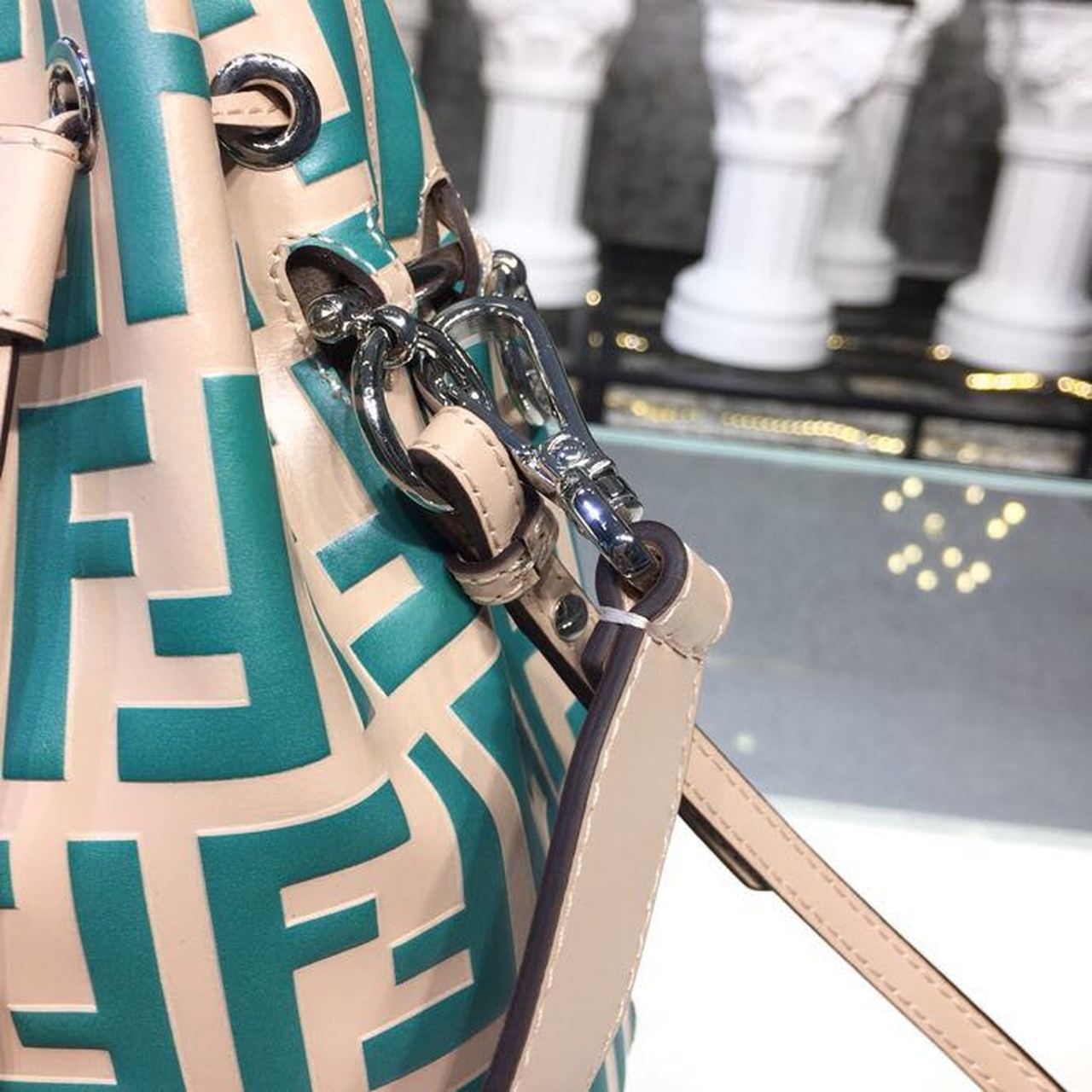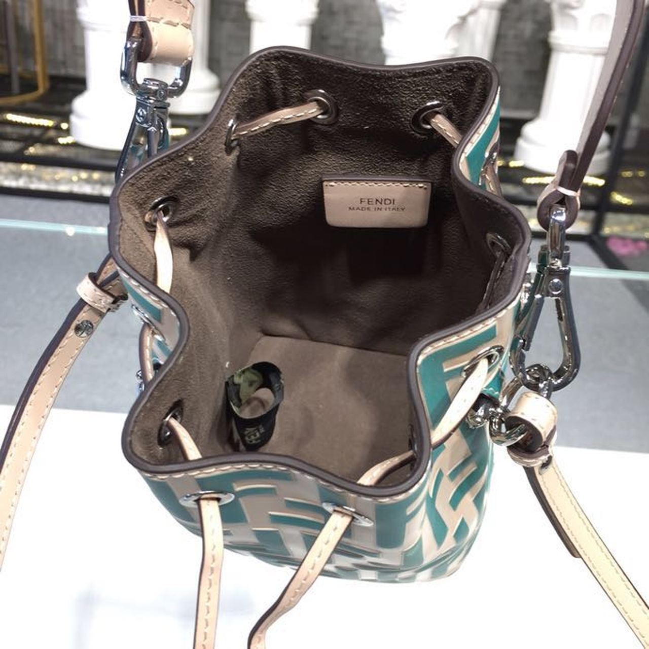Small Mon Tresor bucket bag with drawstring fastening and metal decorations in the FND logo shape. Two detachable shoulder straps, one long and one short, to carry the bag in the hand, over the shoulder or cross-body. Iconic FF pattern printed in relief and hand-painted in teal.