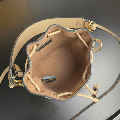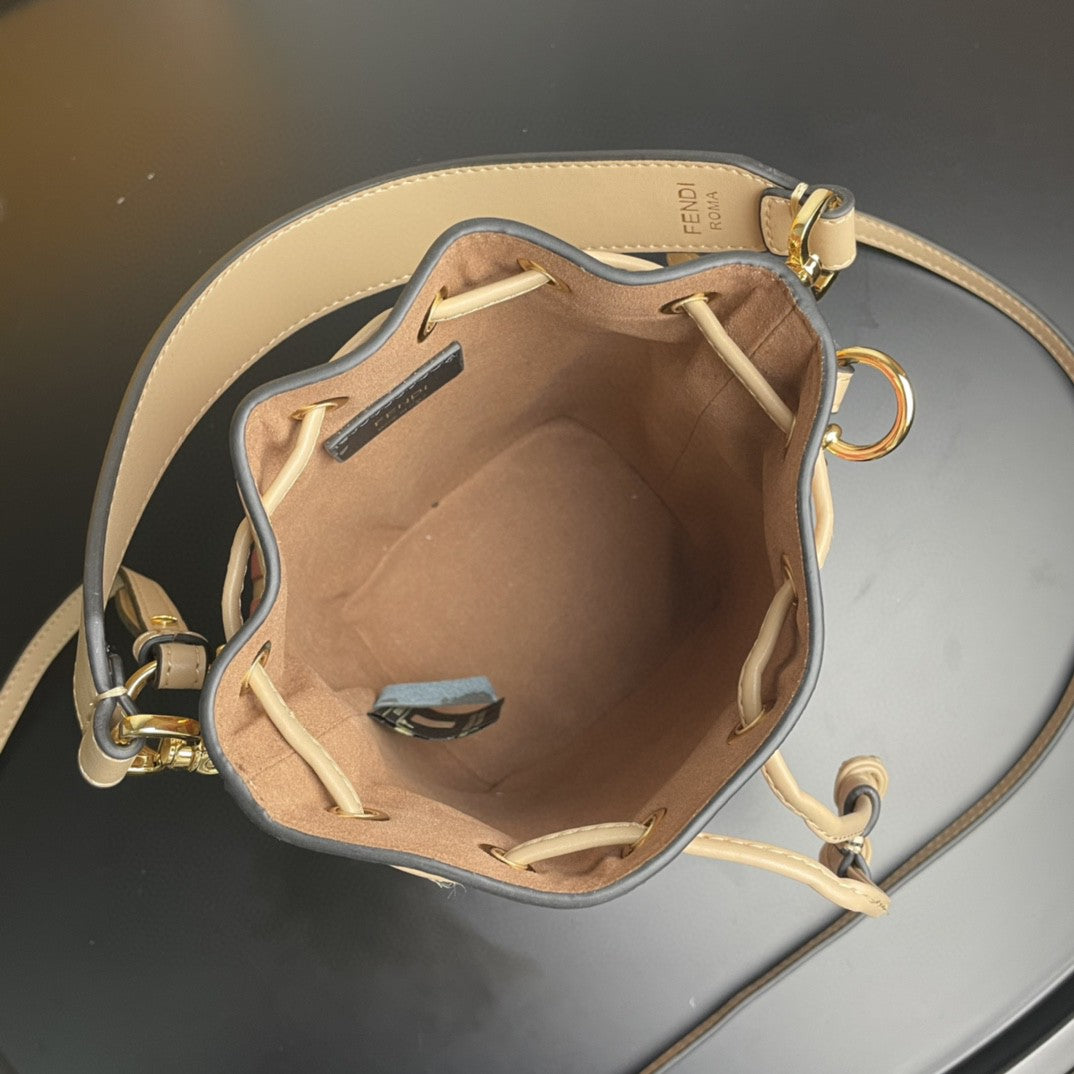Mini Mon Tresor bucket bag with drawstring fastening and metal decorations in the FND logo shape. Two detachable shoulder straps, one long and one short, to carry the bag in the hand, over the shoulder or cross-body. Made of pink calfskin. Iconic FF pattern printed in relief and hand-painted. Gold-finish metalware.