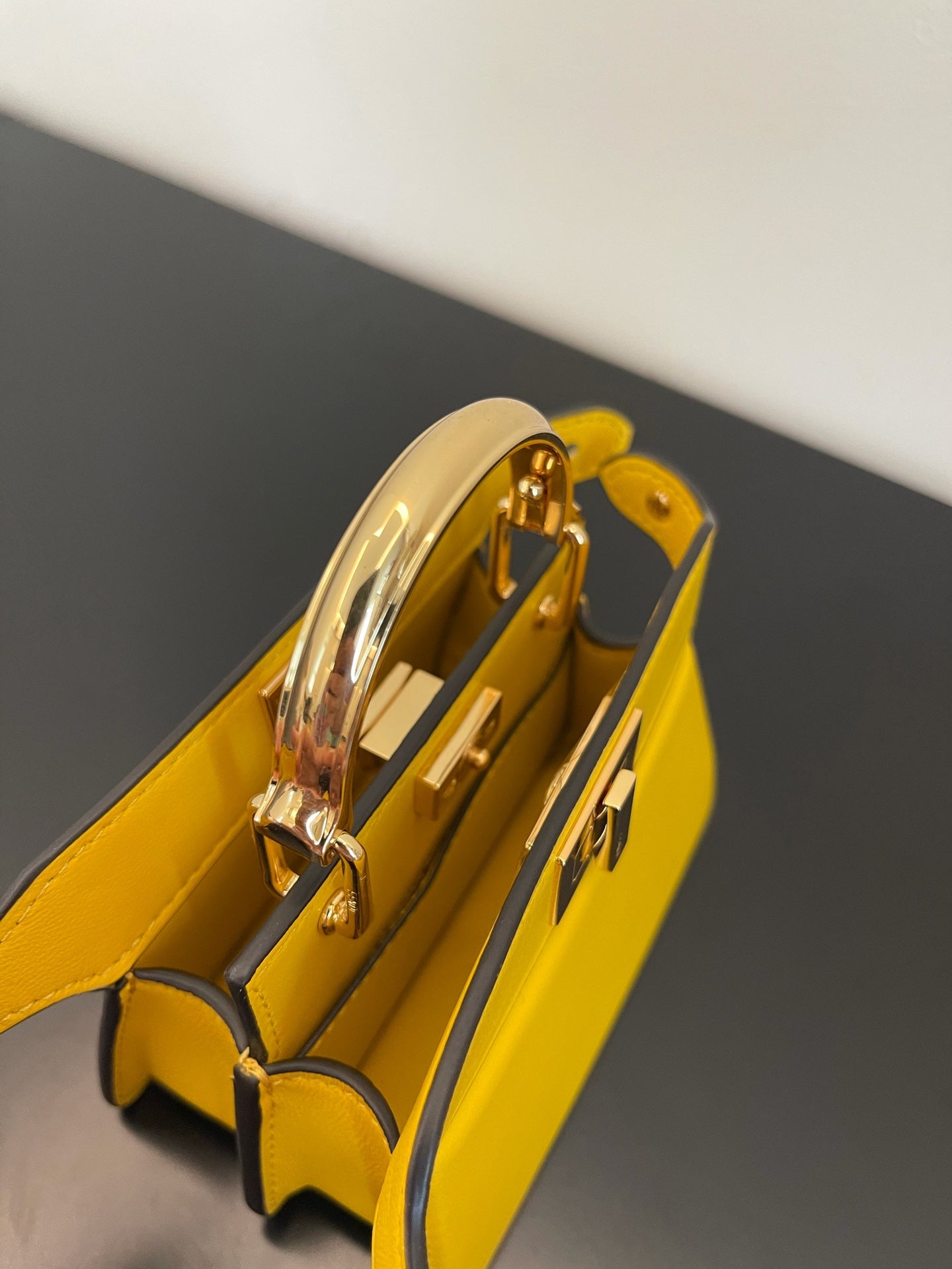 Iconic Peekaboo ISeeU bag in an ideal, compact size. Made from soft, padded, Yellow nappa leather and embellished with the classic twist lock on both sides.