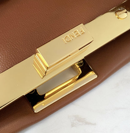 Iconic small Peekaboo bag made of brown finely brained leather and embellished with the classic twist lock on both sides.