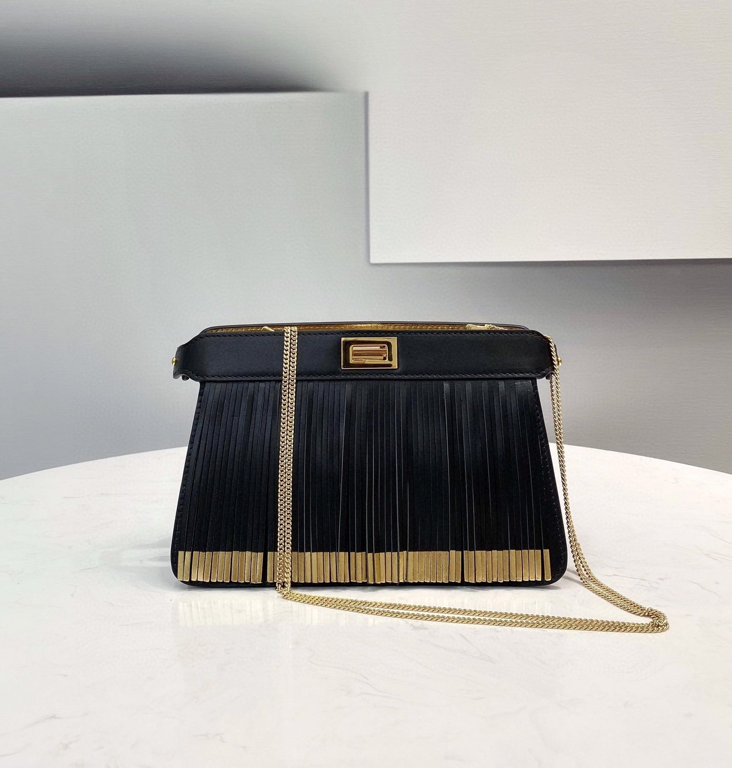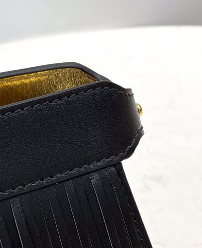 Iconic Peekaboo ISeeU small bag made from black leather, finished with long leather fringes with a gold laminated bottom. Decorated with iconic twist lock on both sides.