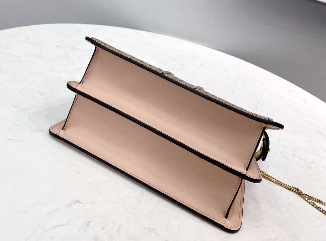 Can be carried by hand or worn on the shoulder thanks to the detachable fine chain shoulder strap.