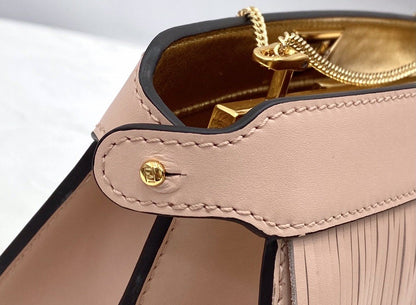Iconic Peekaboo ISeeU small bag made from pink leather, finished with long leather fringes with a gold laminated bottom. Decorated with iconic twist lock on both sides.