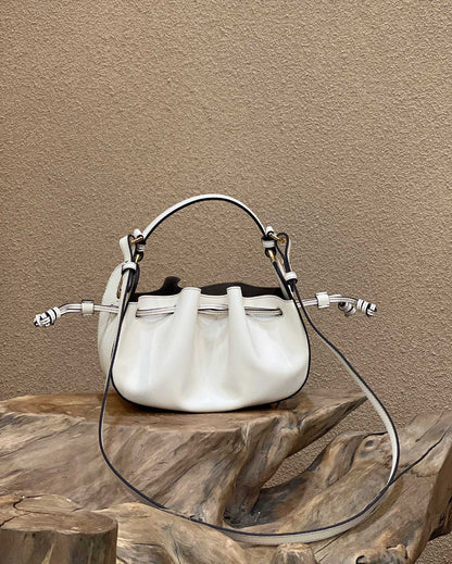 Mini-bag with drawstring closure made of white leather and tone on tone full grain leather.