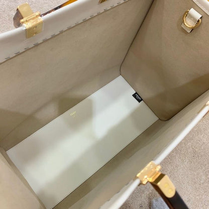 Sunshine Shopper bag made of cream with hot-stamped “FND ROMA” and stiff tortoiseshell plexiglass handles. Equipped with a spacious lined internal compartment. Can be carried by hand with the two handles, and two inner hooks allow you to attach a shoulder strap.