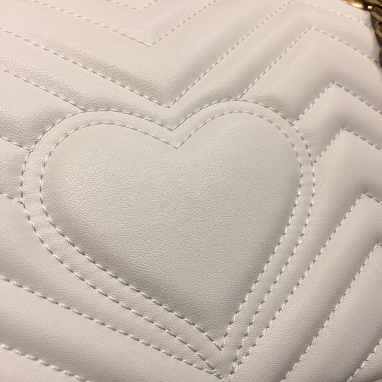 The small GG Marmont chain shoulder bag has a softly structured shape and an oversized flap closure with Double G hardware. The sliding chain strap can be worn multiple ways, changing between a shoulder and a top handle bag. Made in matelassé chevron with a heart on the back.