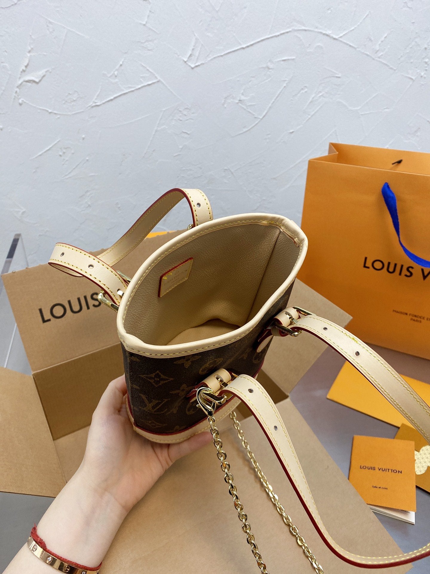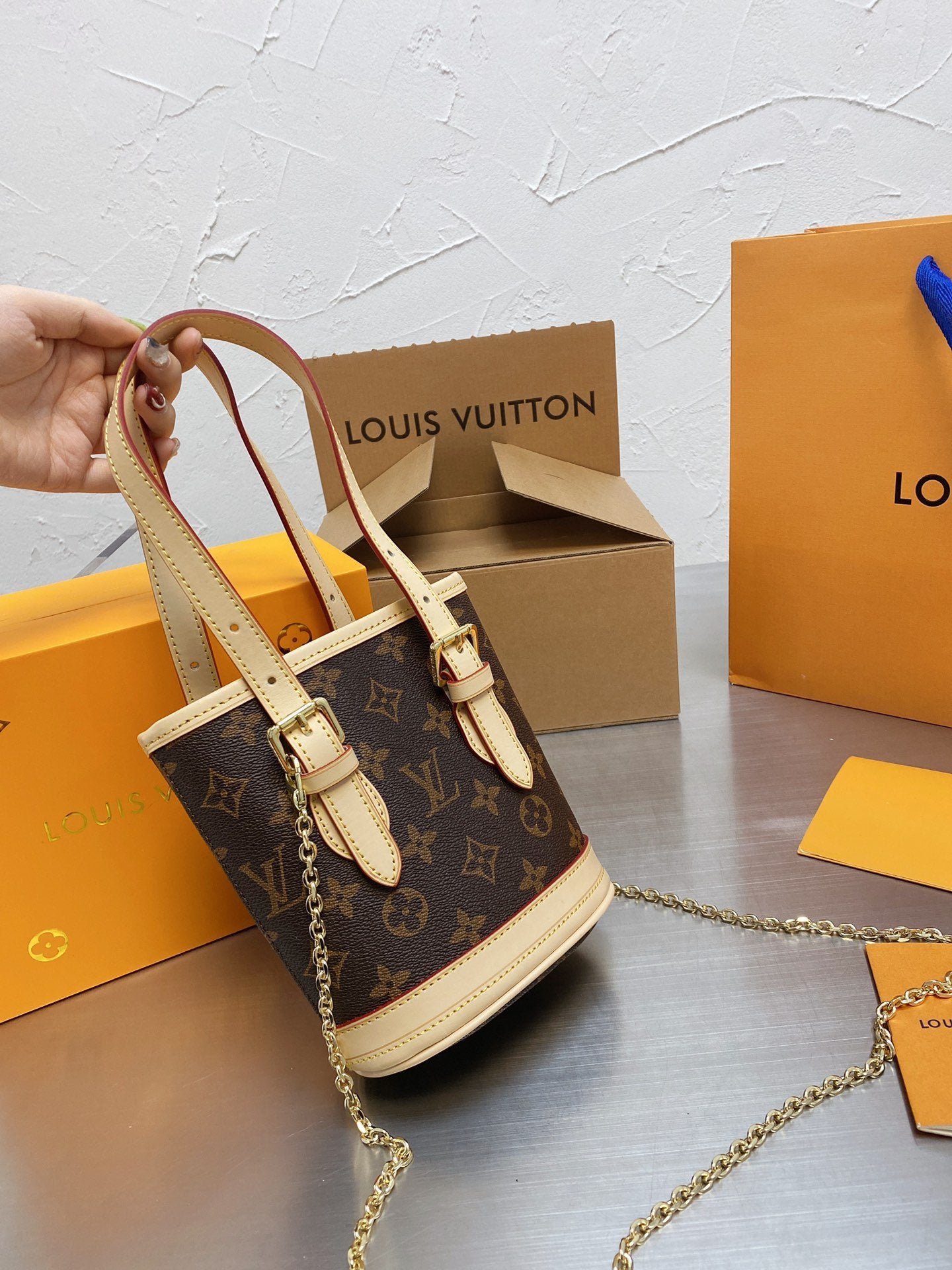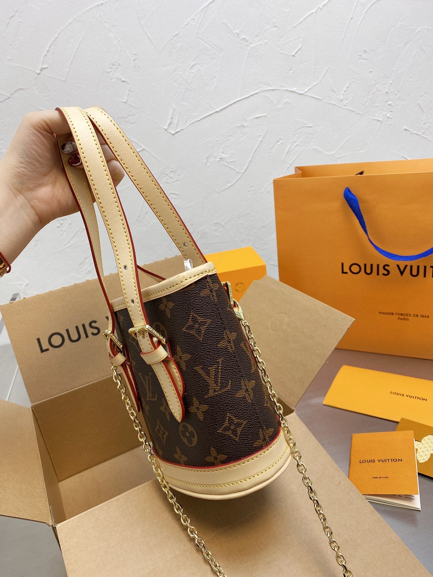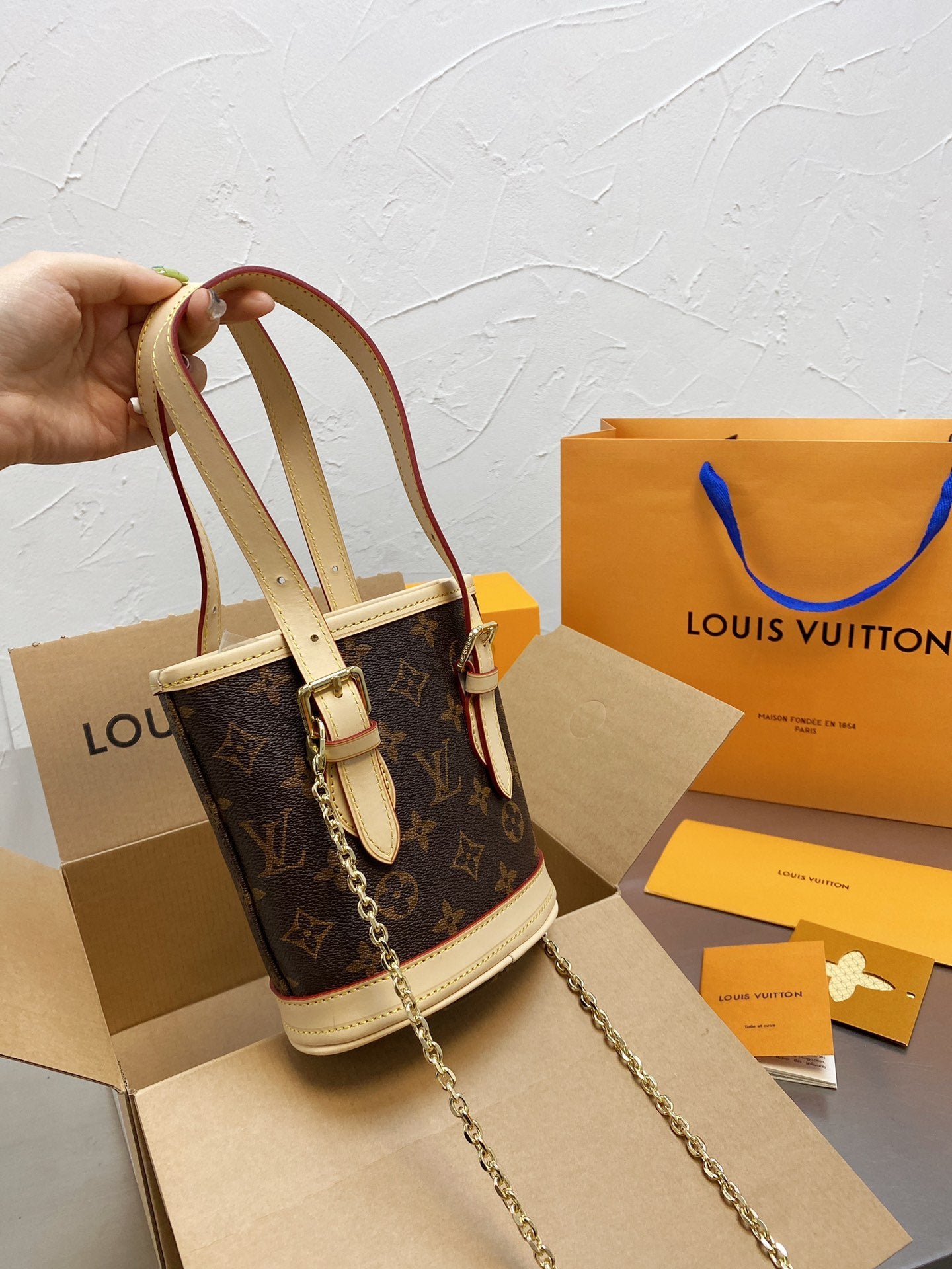 Includes Shipping bags, dustbag sleeper, care manual, booklet, tag.