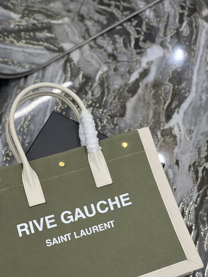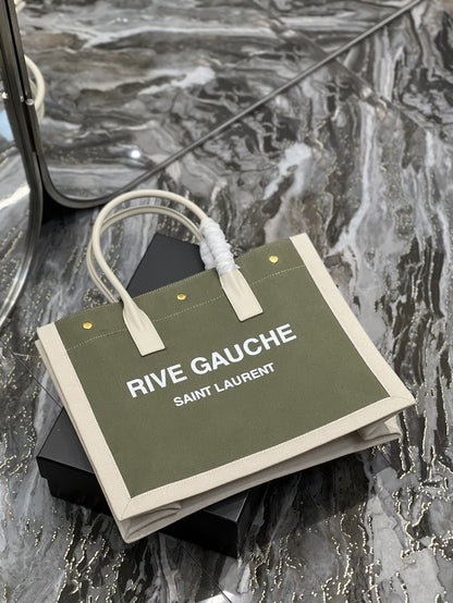 S.L Rive Gauche Small Tote Bag In Linen Military Green For Women 15.4in/39cm YSL 617481FAADI3281